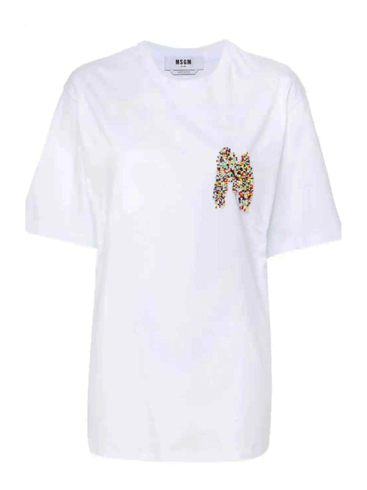Logo en coton tissé à encolure ronde avec perles colorées, manches courtes, épaules basses, ourlet droit