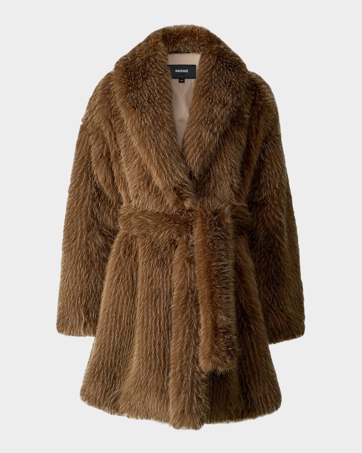 The "Kacela" midlength coat by Mackage is crafted from faux fur (polyester) and designed as a statement piece to complete any winter wardrobe Shawl collar Dropped shoulders Long raglan sleeves Removable, adjustable selftie belt Relaxed fit Hem falls to the hip Wrap closure Polyester Lining: Polyester/viscose Professional cleaning recommended Imported