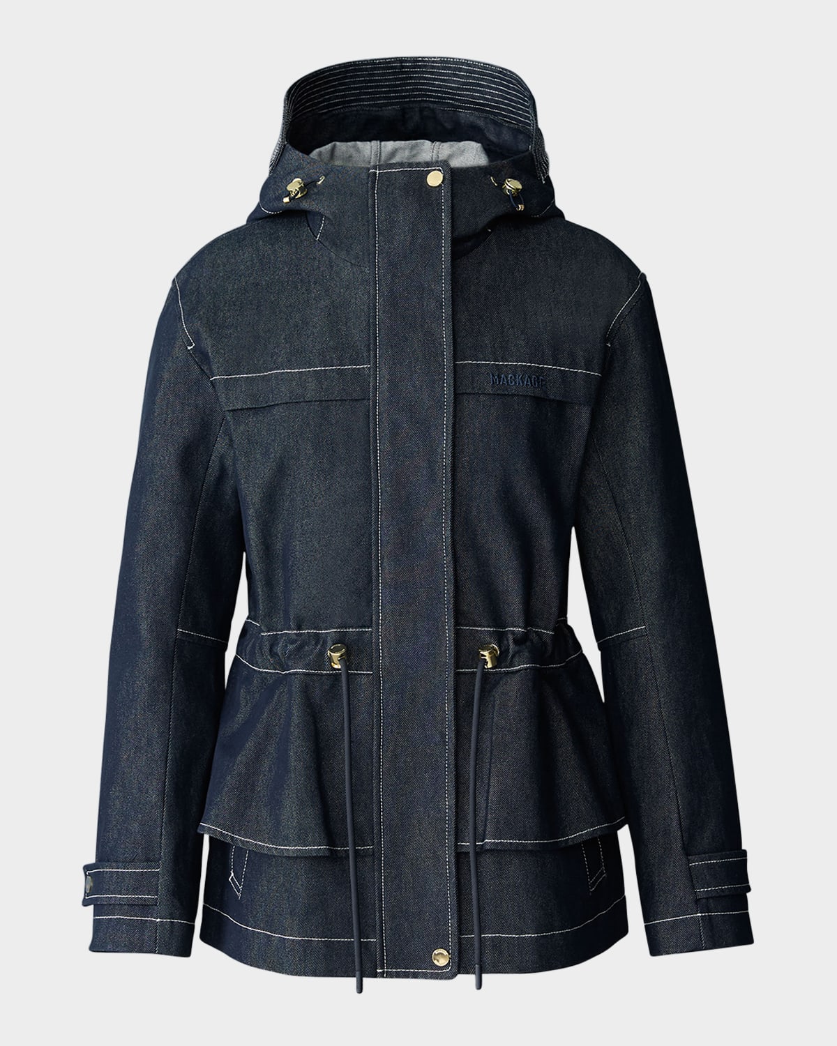 Mackage "Kaori" recycled twill jacket enhanced with a peplum detail and goldtone hardware Windresistant Adjustable drawcord hood with storm visor Long sleeves with adjustable snap cuffs Embroidered logo on the left chest Adjustable drawcord waist Side slip pockets; interior pocket Slim fit Hem sits at the hip Zipfront with snapplacket Organic cotton Lining: Cotton Machine wash Imported