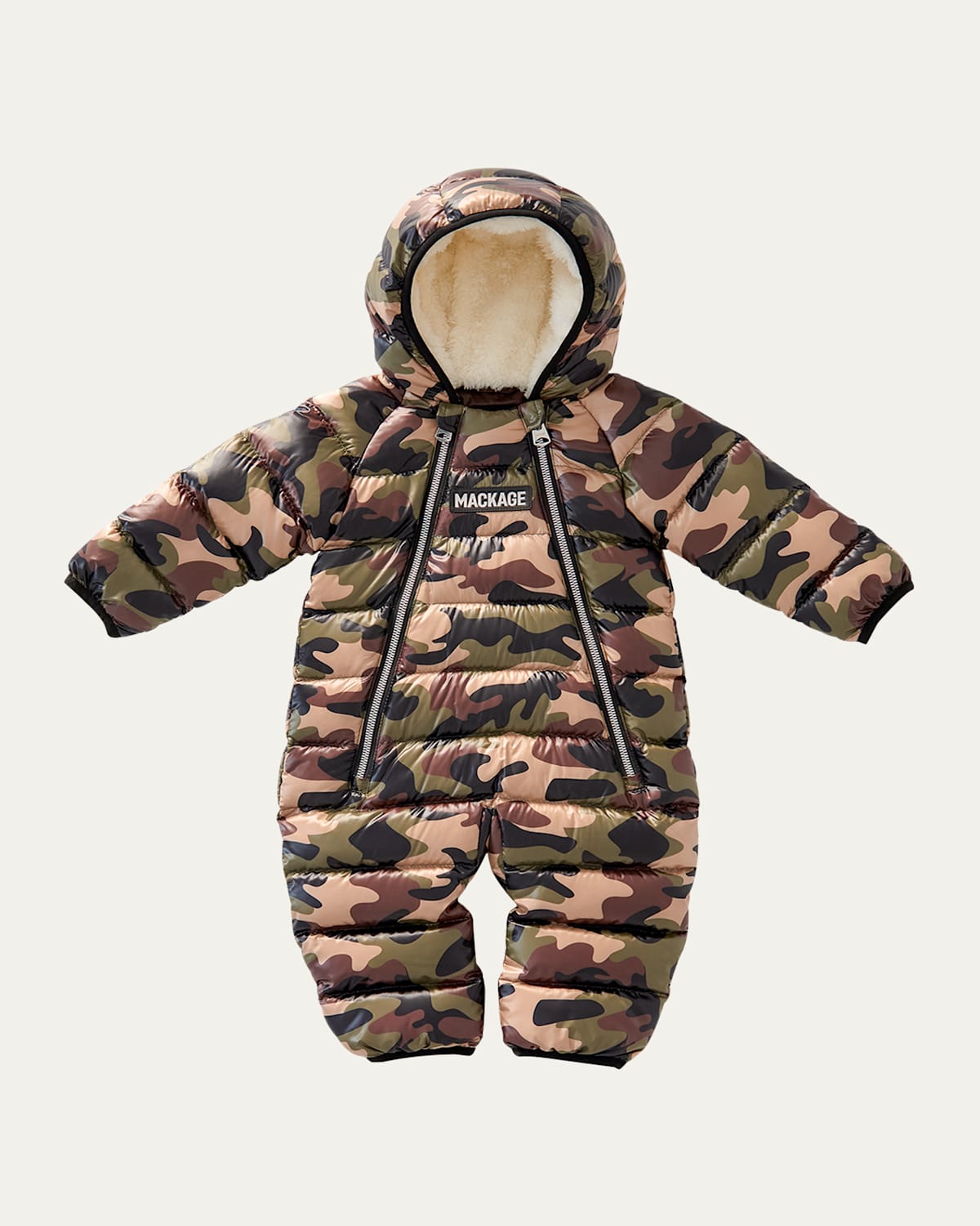 Mackage "Bambi" weightless nano down snowsuit in a camouflage pattern with channel quilting Hooded neckline with faux fur (polyester) lining Long sleeves with elastic binding and foldover mittens Signature wordmark chest patch Relaxed fit Full length Double angled front zip closure Polyester Recycled down/feather fill Lining: Recycled nylon/recycled polyester Machine wash Imported