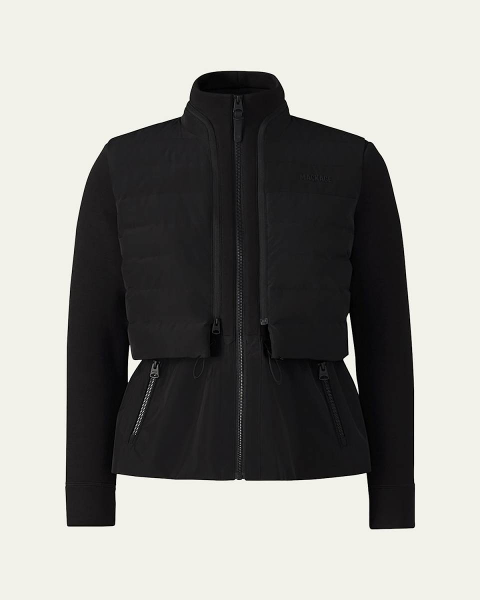 Mackage "Priscilla" 3in1 hybrid jacket crafted from recycled materials Removable quilted down vest; zips connect layers Stand collar Long sleeves with banded cuffs Tonal silicone logo at chest Adjustable drawcord waist (inner layer) Zip pockets (inner layer) Adjustable fit Peplum hem Zipfront Cotton/polyester Fill: Down/feather Lining: Polyester Dry clean or machine wash Imported