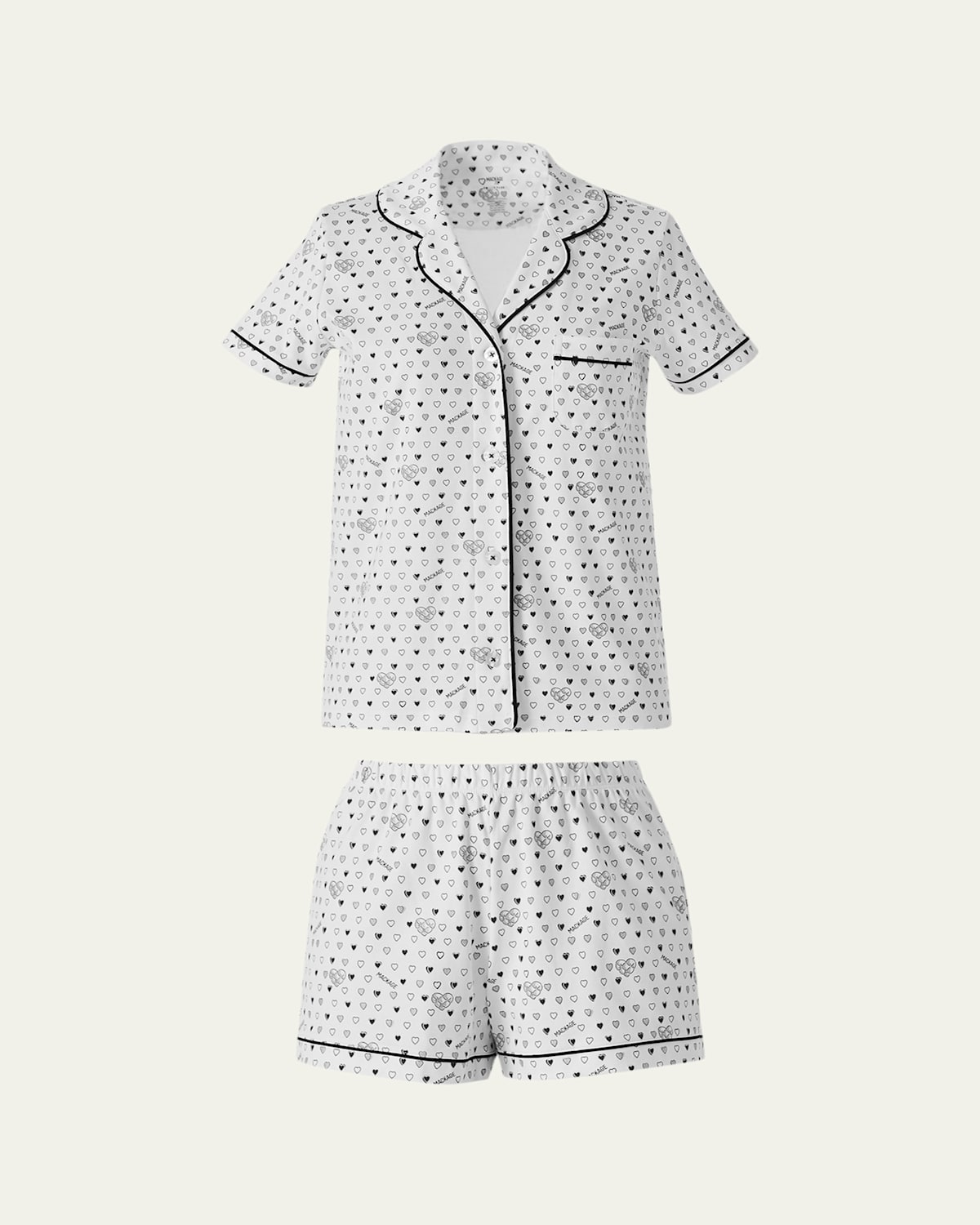 This Mackage x Roller Rabbit pima cotton pajama set is printed with hearts and trimmed with contrast piping for a refined finish Notched lapels; button front Short sleeves Chest patch pocket Relaxed fit Elasticized waistband Relaxed legs Pullon style Cotton Machine wash cold Imported