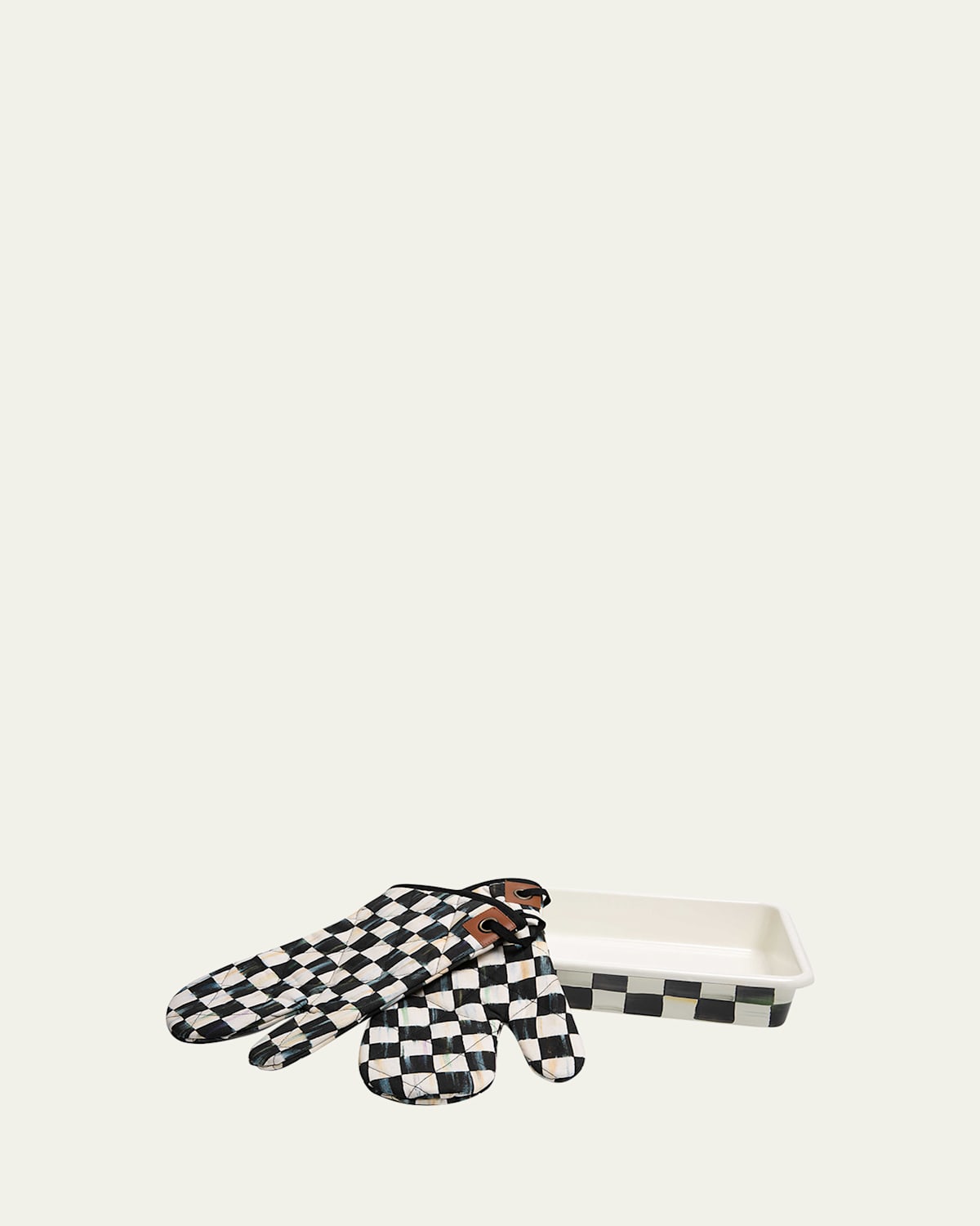 Handcrafted enamel baking set features signature Courtly Check ® pattern Includes a baking pan and pair of oven mitts Made of cotton, steel and brass Approx. 15.25"L x 13.0"W x 6.5"T Item Weight (Lbs.): 4.0 Imported
