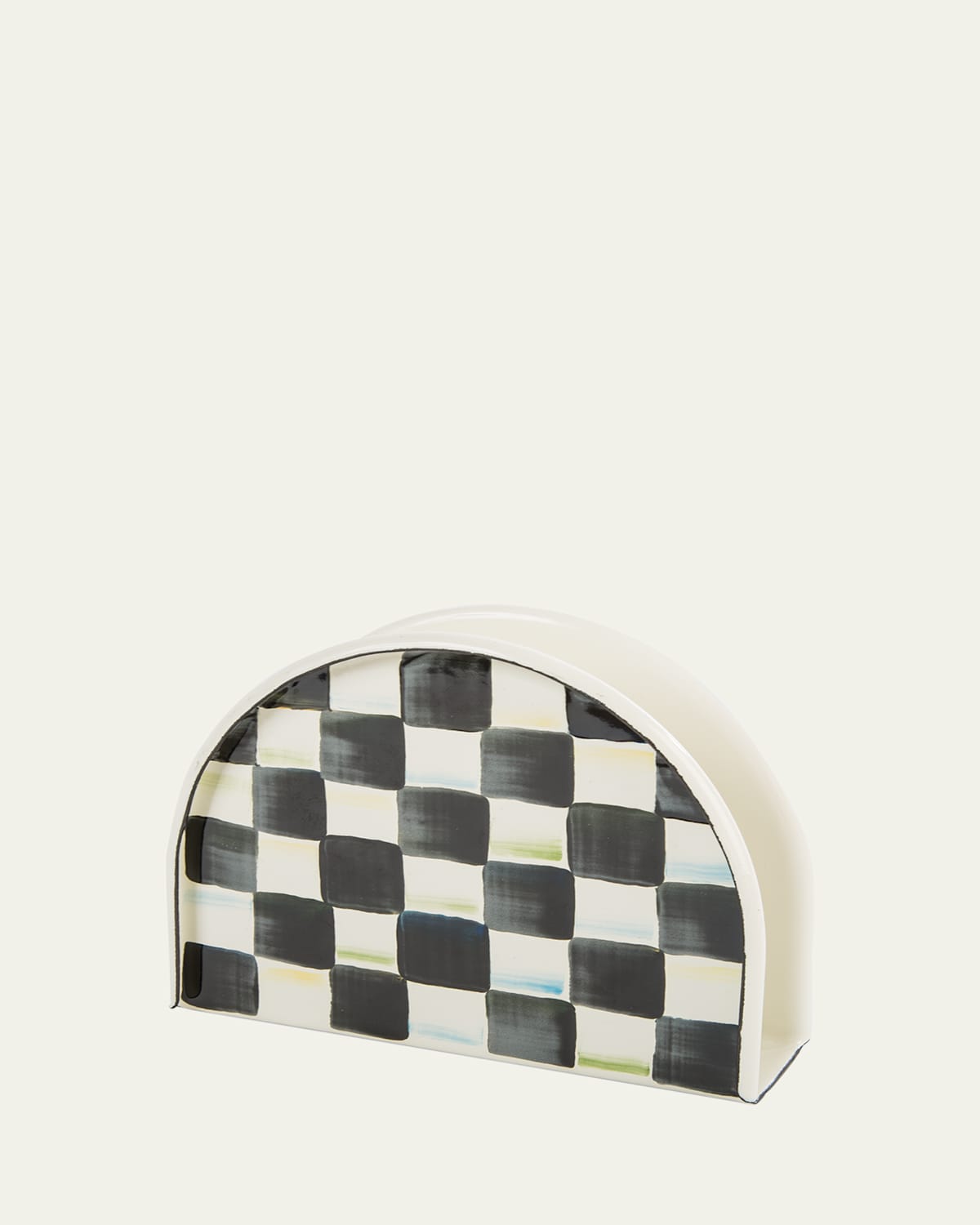 Enamel napkin holder with check pattern. 6.75"W x 3.75"D x 4.25"T. Imported.