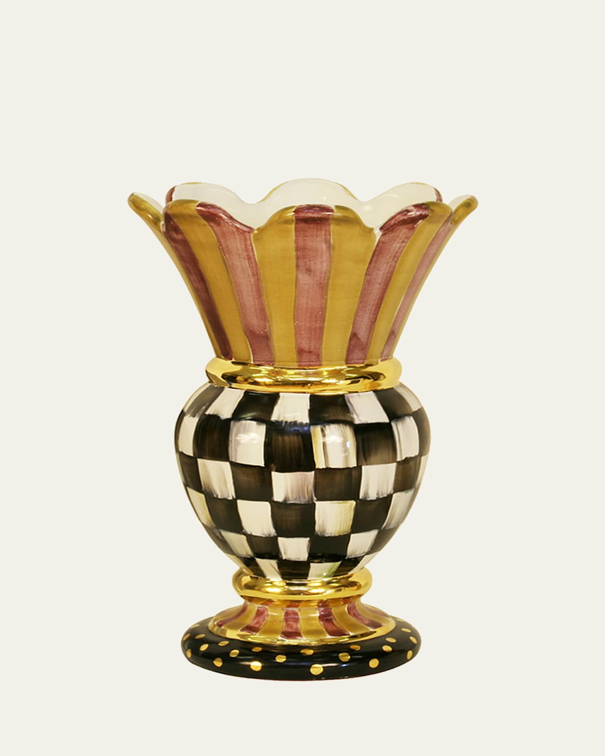 Handpainted majolica with vibrant stripes, Courtly Checks®, and goldtone rimming and dots. 7.5"Dia. x 11.5"T. Being handcrafted, each will be unique and vary slightly. Finished with the artisan's stamp on the bottom. Hand wash. Made in the USA.
