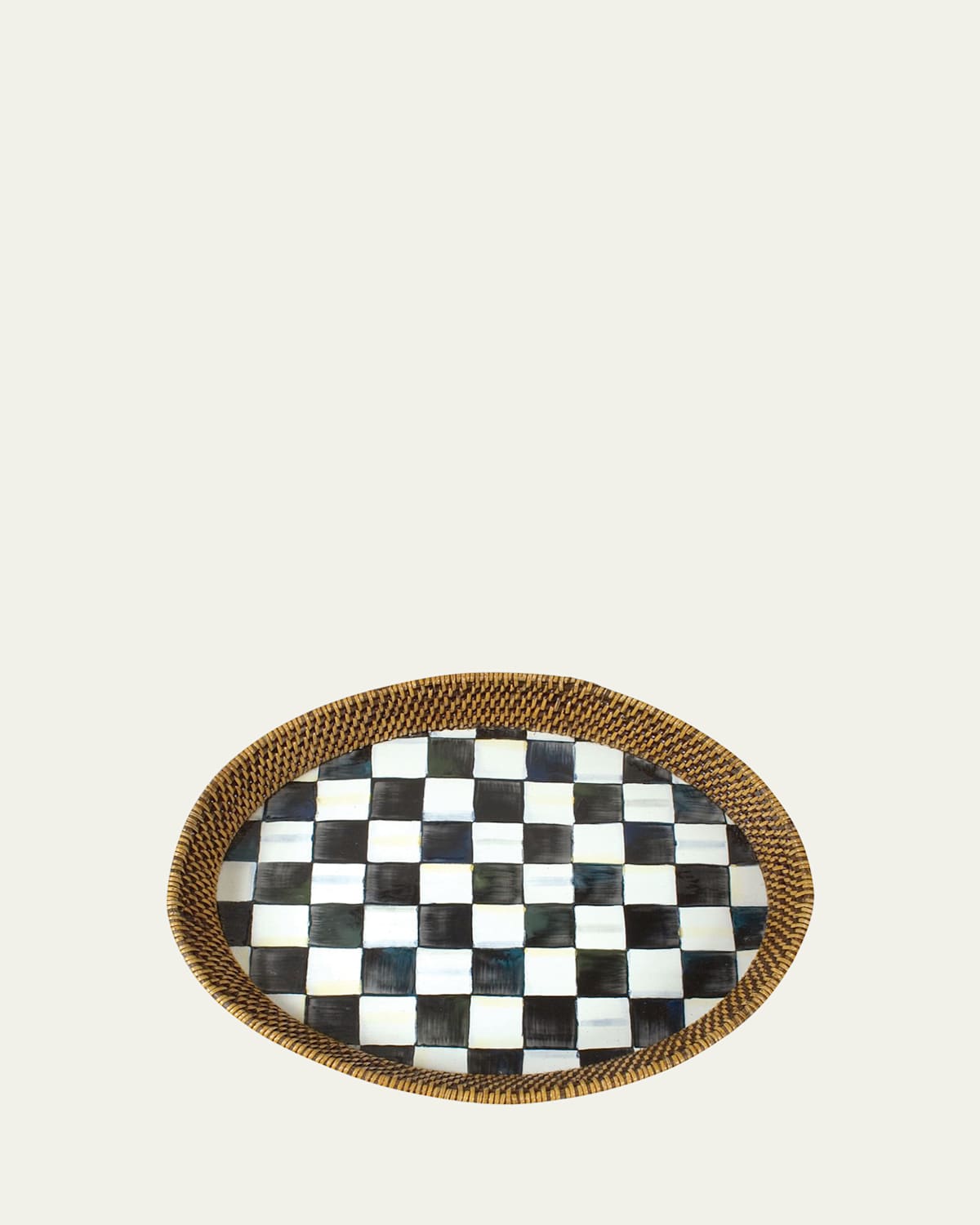 Tray made of 12gauge steel glazed with handpainted black and white checks. Woven rattan trim. Approximately 15.25"W x 11.5"D x 2"T. Imported.