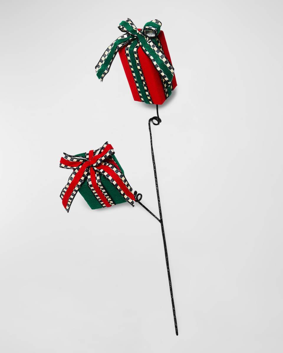 Christmas pick features gift packages with Courtly Check® trim Made of plastic Approx. 25"L x 6.0"W x 3"T Item Weight: 0.2 lbs Imported