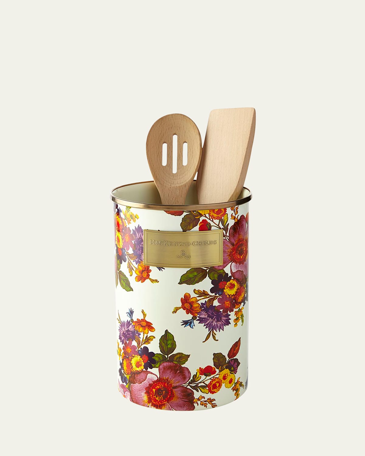 Handcrafted utensil holder. Heavygauge, handglazed steel underbody with handapplied transfer decoration. Rimmed in bronzed stainless steel. Due to the nature of handcrafting, utensil holders may vary slightly. 5"Dia. x 8.5"T. 20 oz. capacity Hand wash. Imported.