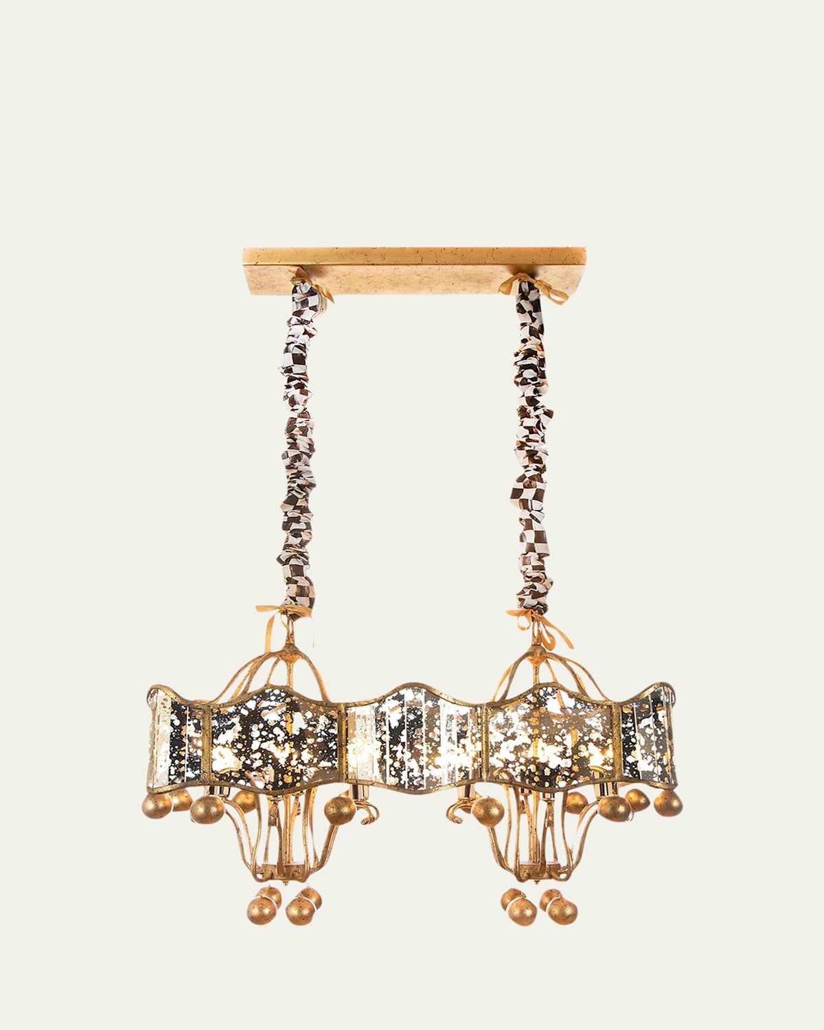 Chandelier is made of metal/glass/wood. Uses 12 40watt candelabra bulbs. Overall, 32.5"W x 18"D x 20"T.. Canopy, 24"W x 5"D x 1.5"T. Chain, 6 ft. Professional installation recommended. Imported. Boxed weight, approximately 41 lbs.