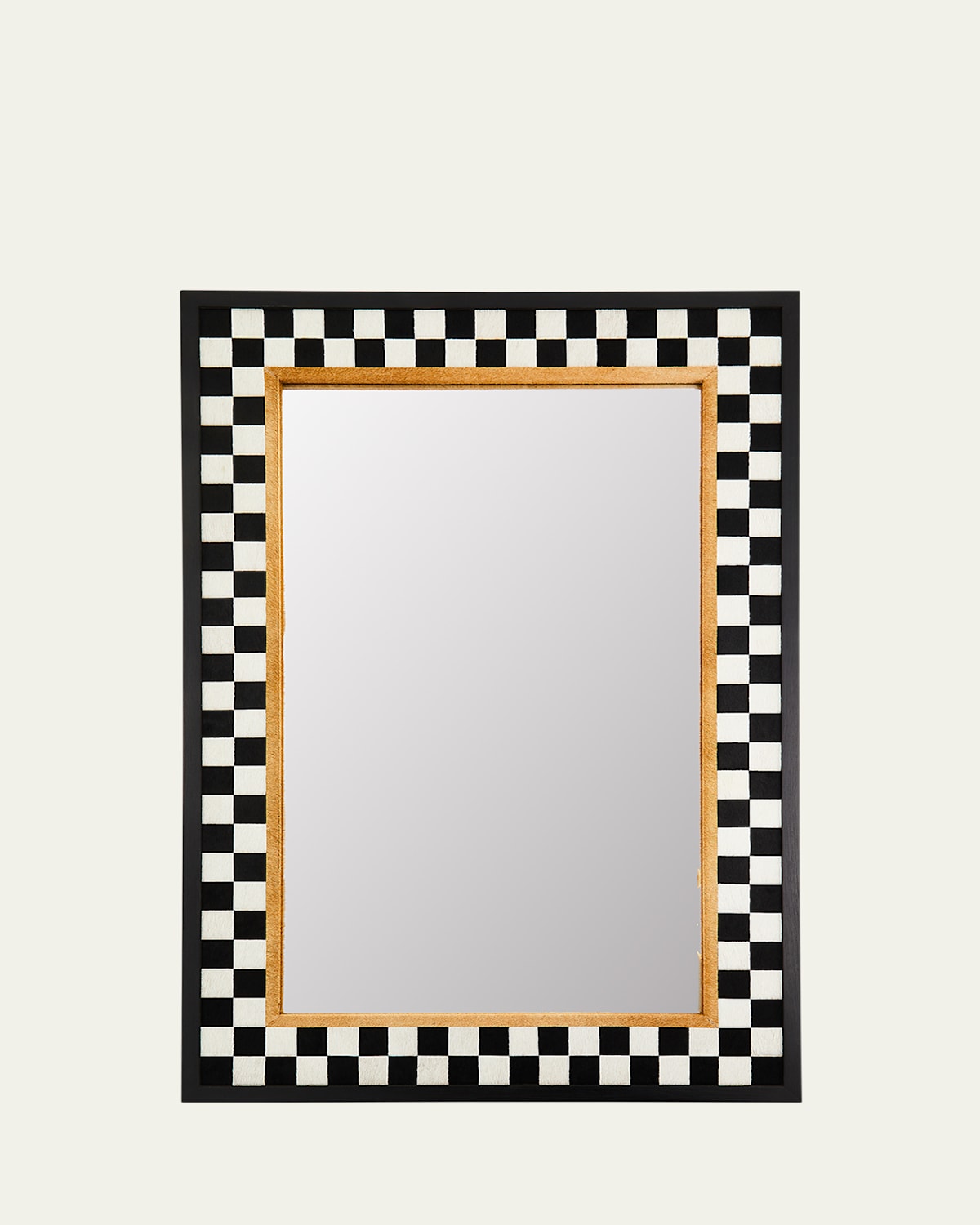 As you head out the door, why not "check" yourself out with this rectangular beveled mirror, featuring cow haironhide checks with stained oak veneer around the mirror window. Handcrafted of engineered hardwood, treated cow haironhide (India), and glass Approx. 23.8"W x 35.5"T x 1.5"D Reflective dimension, 28"T x 16.8"W Metal cleats on the back for hanging Can be hung horizontally or vertically Weight, 27.0lbs Dust lightly with a soft, dry cloth. Mirror surface can be cleaned using glass cleaner. Imported Boxed weight, approximately 38.5lbs