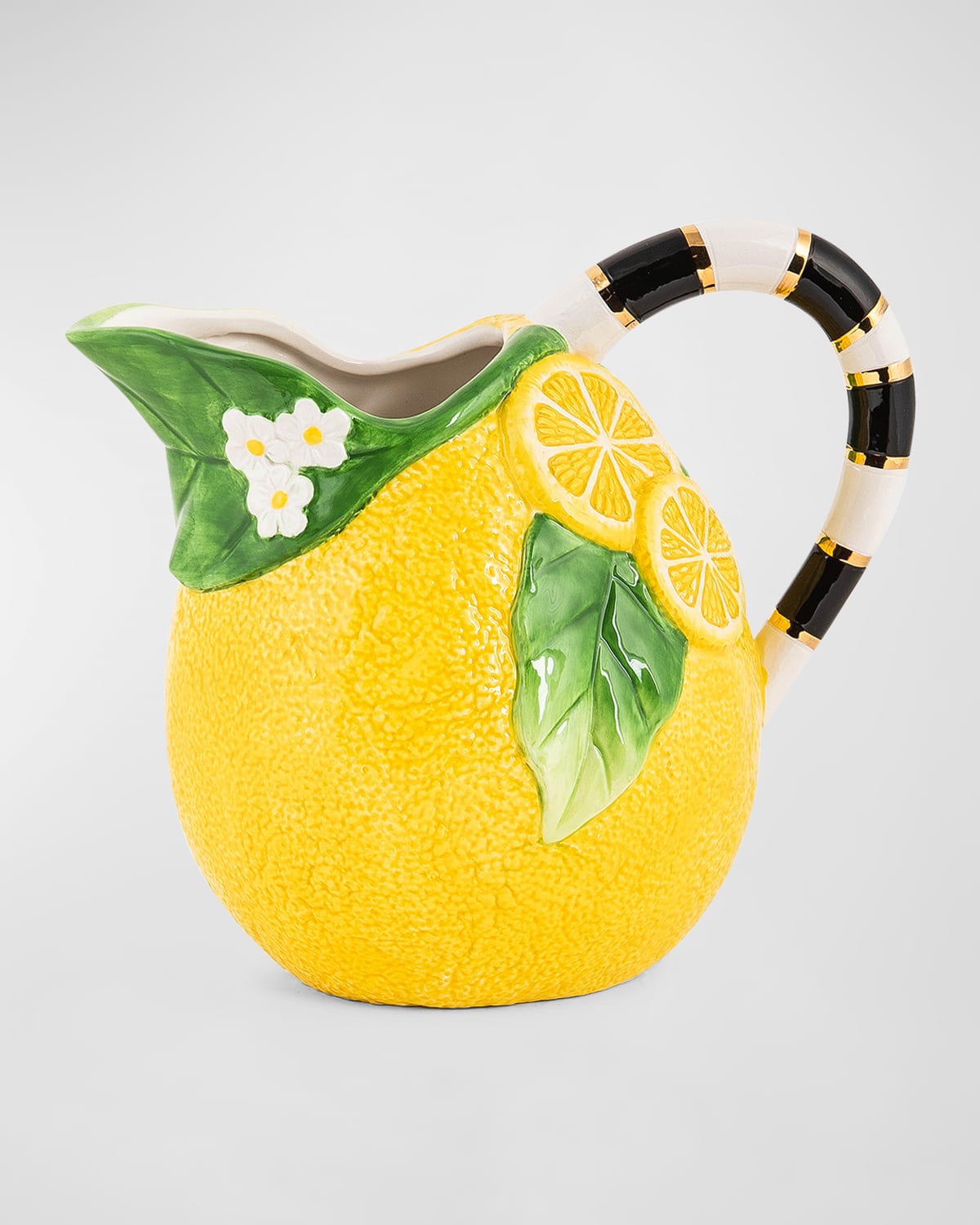 For ice water, freshsqueezed lemonade, or a refreshing punch, the Lemon Pitcher dresses up the bar or dinner table. Styled like a lemon, it's finished with a Courtly Check® handle with goldtone accents. Handcrafted of ceramic Approx. 9.5"W x 7.5"D x 10"T Capacity, 56 oz. Item Weight (Lbs.): 1.0 Hand wash Imported