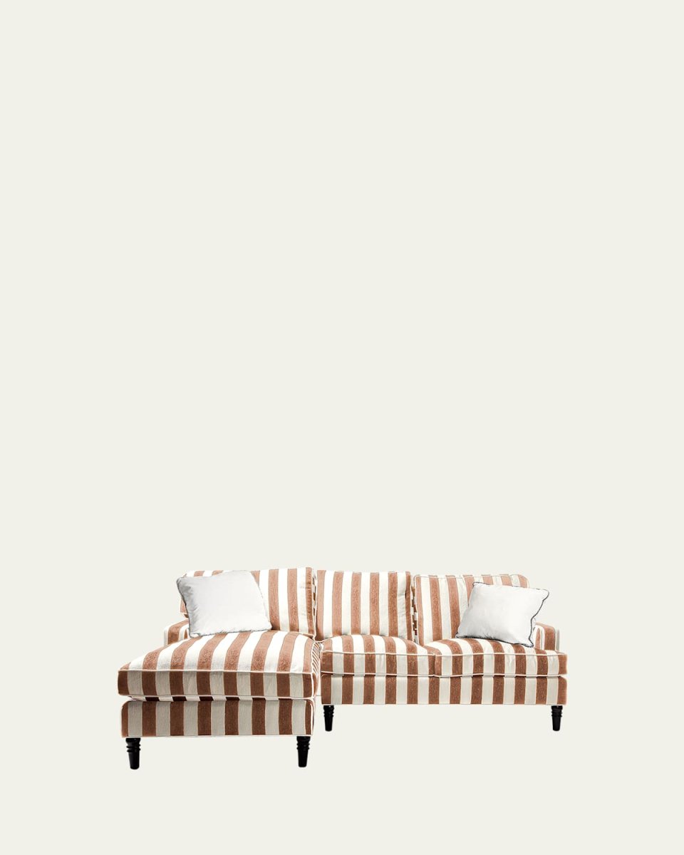 Settle into the Marquee Brown Stripe 2Piece Left Arm Chaise Sectional, consisting of a settee and a chaise for lounging. Domestic hardwood frame with upholsteryweight cotton chenille and custom decking Includes two toss pillows filled with feather and down Overall, approx. 85"W x 64"L x 34"T Seat, 46"D x 29"W x 20"T Arm height, 25" Vacuum periodically with upholstery attachment. Spot clean as needed with a mold solvent for small satins. Dust legs with a soft clean cloth. Made in USA Weight, 354.0lbs Boxed weight, approximately 354.0lbs