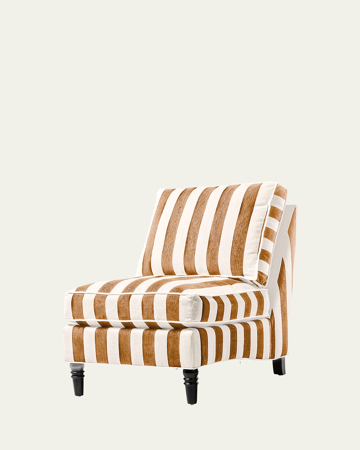 The Marquee Brown Stripe Chenille Armless Chair features a classic yet modern silhouette Maple wood frame wrapped with striped cotton chenille upholstery Back cushions, down and fiber down fill Seat cushions, high support comfort foam Overall, approx. 26"W x 34"T x 39"D Seat, 26"W x 21"D x 20"T Vacuum periodically Made in USA Weight, 55.0lbs Boxed weight, approximately 55.0lbs