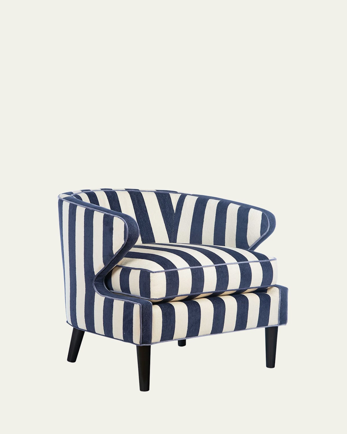 Put your showstopping style up in lights. The Chenille Navy Stripe Marquee Accent Chair is a versatile striped silhouette that mixes and matches with solids and patterns. Accent chair is made of chenille. Upholstery, cotton/polyester. Frame, domestic hardwood. Overall, approx. 28"W x 31"D x 28.5"T. Arm height, 27". Seat width, 22". Seat depth, 19". Seat height, 19". Made in the USA of imported materials. Boxed weight, approximately 55 lbs.