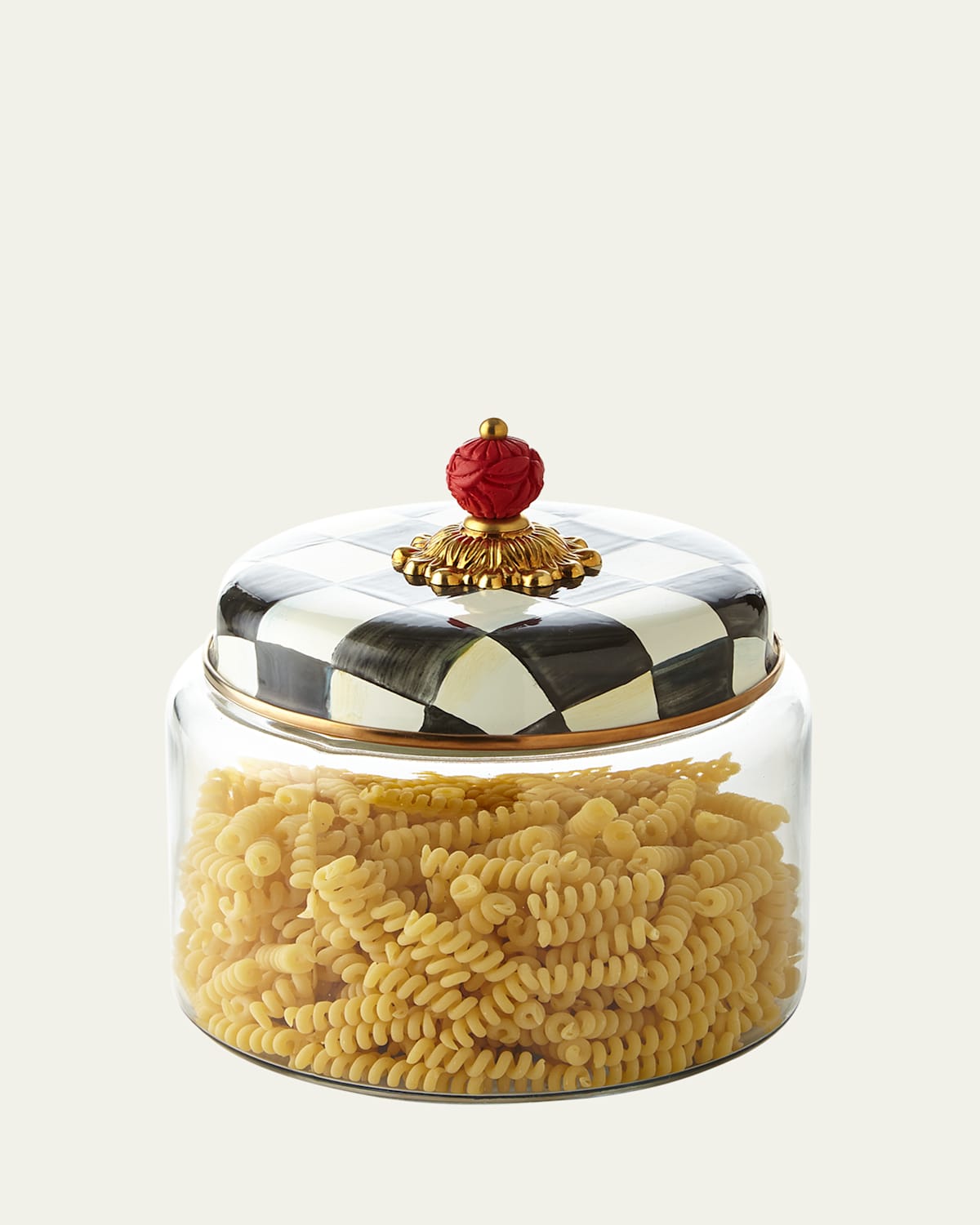 Medium Courtly Check Canister. Floraltextured fauxcinnabar and brass knob. Courtly Check enameled heavygauge steel lid rimmed in bronzed stainless steel. Gleaming glass canister. Lid, hand wash. Canister, dishwasher safe. 64ounce capacity. 7"Dia. x 8"T. Imported.