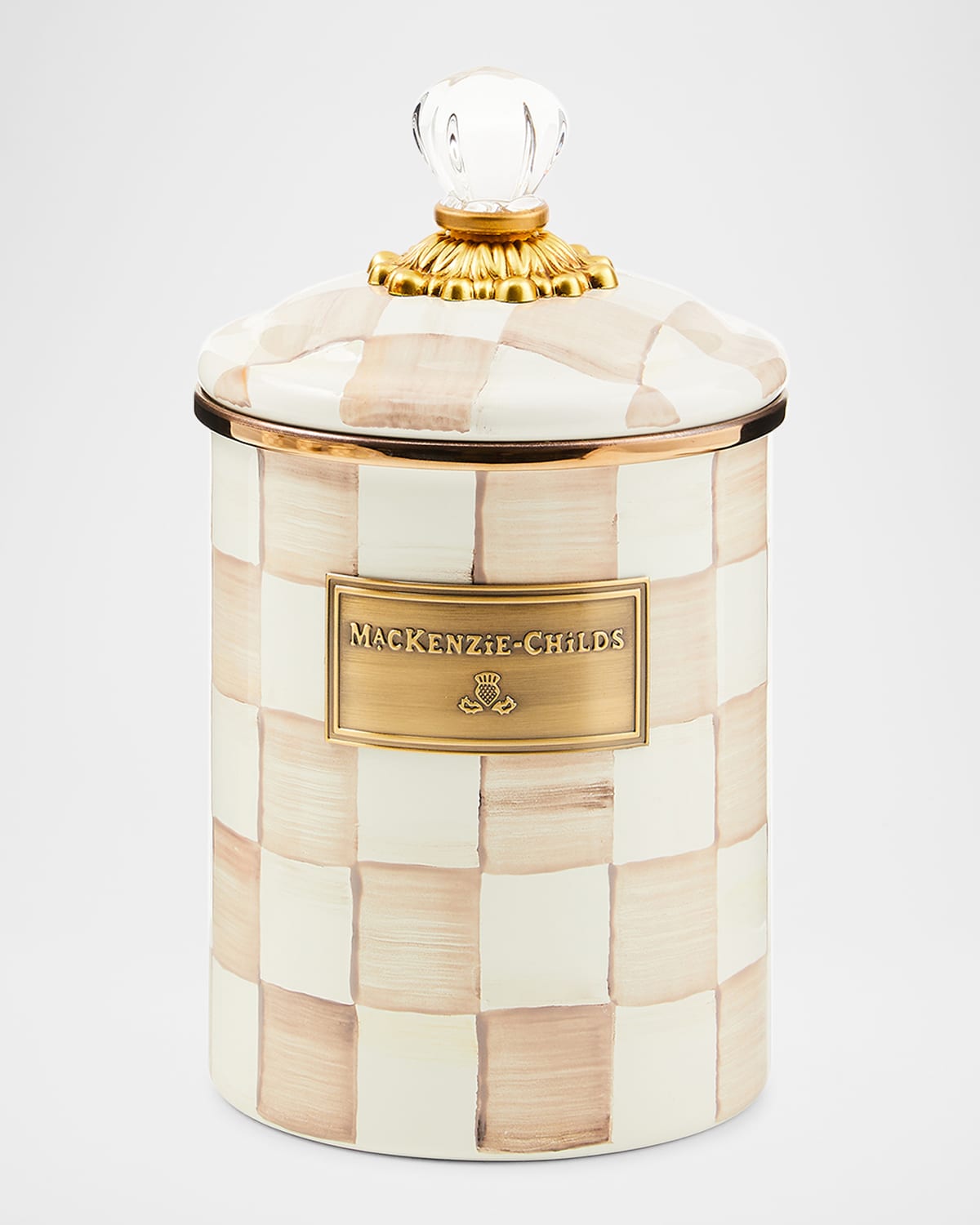 Flour, sugar, and coffee might seem the most obvious of contents with which to fill a Mocha Check Medium Canister, but the possibilities are endless! Keep them in the kitchen with coffee beans and tea bags, cookies and candies, or dog biscuits and birdseed, or invent new uses around the house. Perfect for cotton balls and swabs in the bathroom, pens, and pencils in the office, or knickknacks and doodads in the kids' room. Handcrafted of heavygauge, handglazed steel underbody with handpainted Mocha Checks, rimmed in bronzed stainless steel. Brass and glass accents. Silicone seal inside lid Pieces may vary due to the handmade nature of each product Approx. 7.3"L x 5"W x 8.5"T Capacity, 48 oz. Item weight, 1.7 lbs Wipe clean Do not microwave Imported