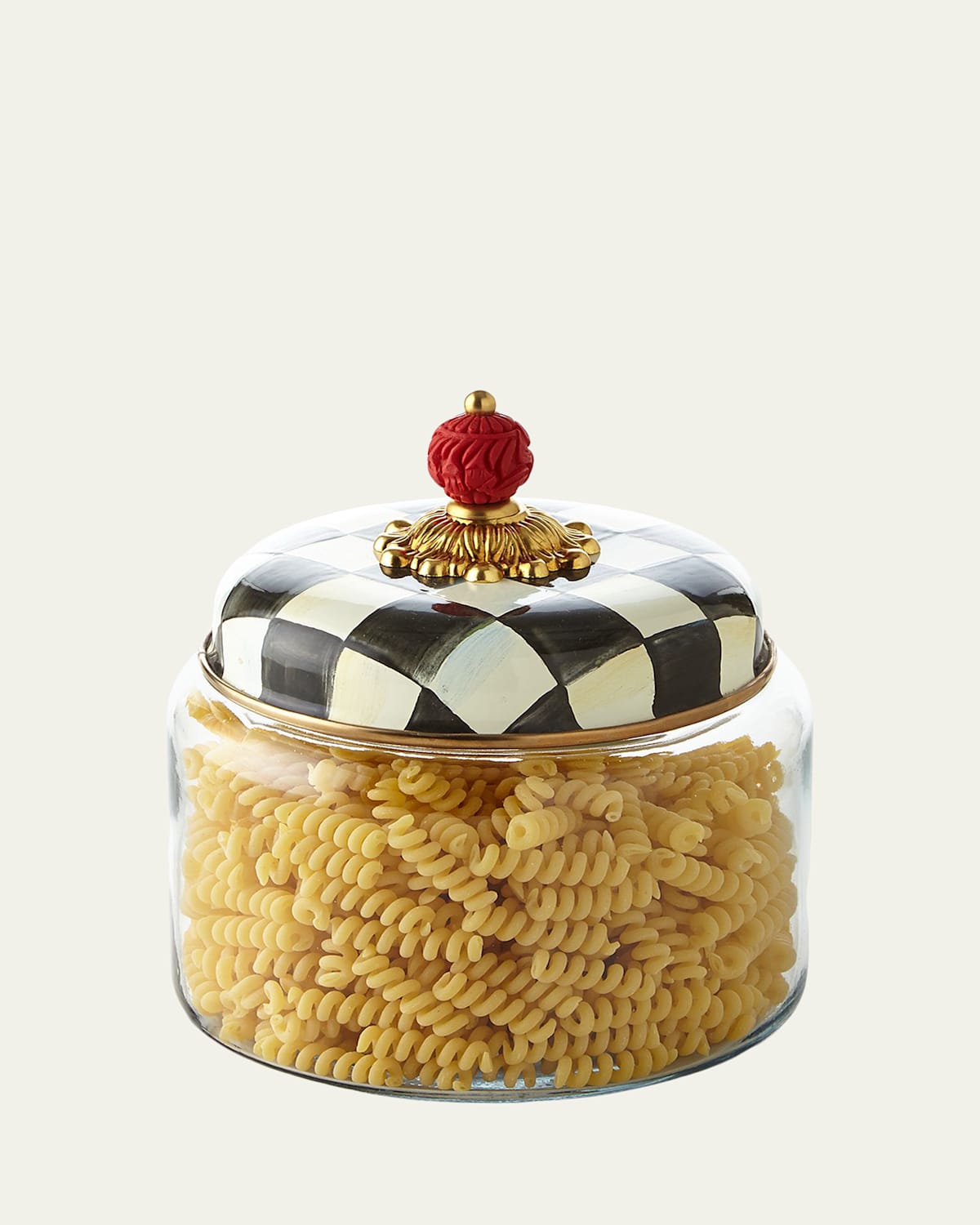 Small Courtly Check Canister. Floraltextured fauxcinnabar and brass knob. Courtly Check enameled heavygauge steel lid rimmed in bronzed stainless steel. Gleaming glass canister. Lid, hand wash. Canister, dishwasher safe. 48ounce capacity. 6.5"Dia. x 7"T. Imported.