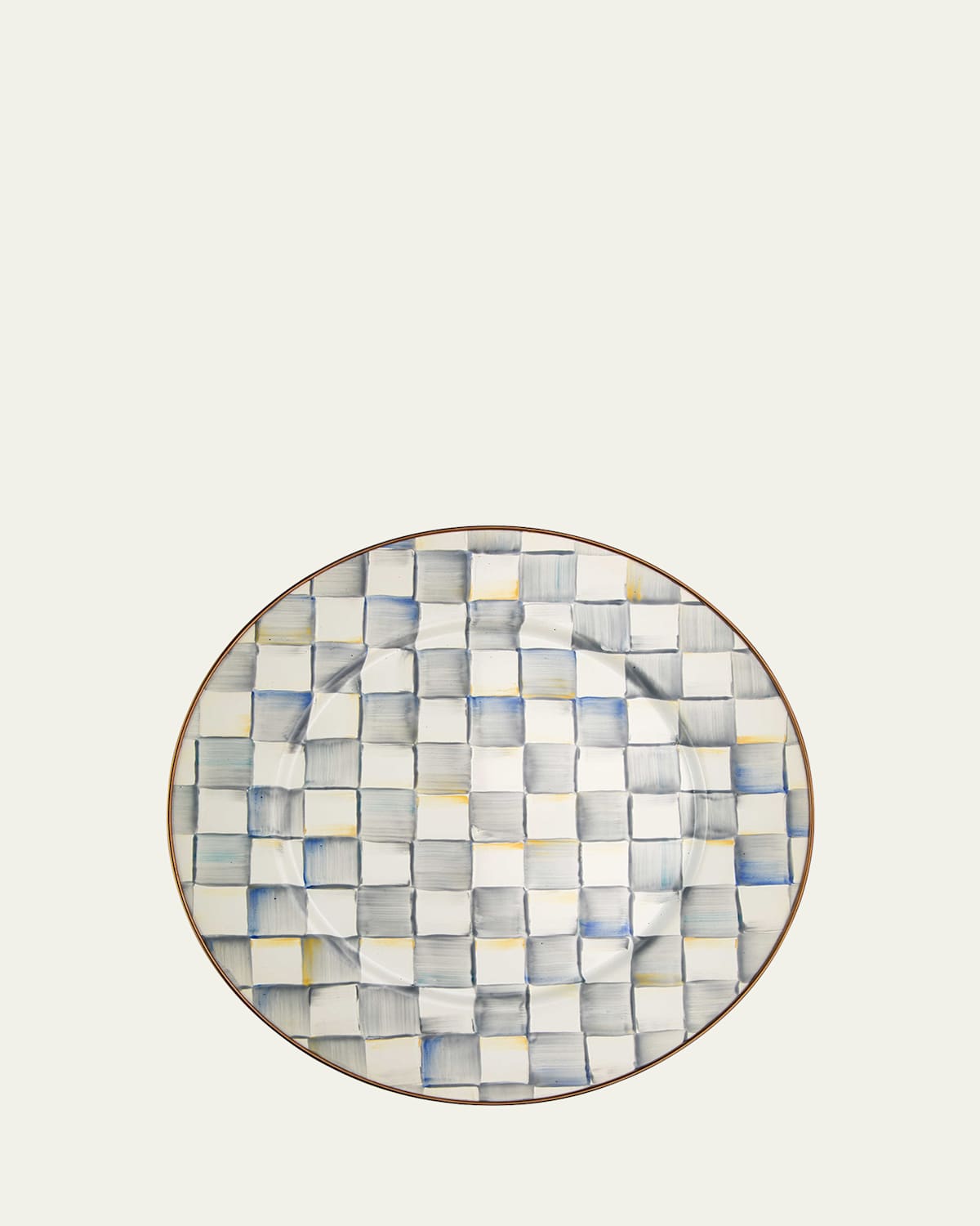 Serve your favorite dishes in style with our Sterling Check Enamel Serving Platter. Similar in theme to our signature Courtly Check® enamel pattern, Sterling Check checks all our boxes The stainless steel underbody is glazed with handpainted, colordragged checks in subtle shades of grey and rimmed in bronzed stainless steel Approx. 16"Dia. x 1"D Item Weight (Lbs.): 2.3 Imported