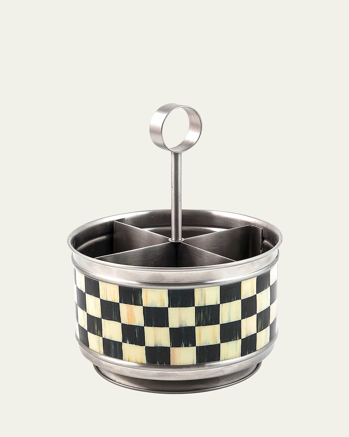 Caddy is handcrafted stainless steel with a clear enamel coating. Pieces may vary due to the handmade nature of each product. Approx. 7"Dia x 9.3"T Item Weight: 1.7 lbs Imported