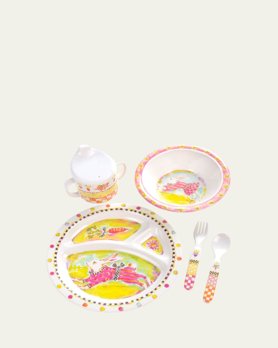 MacKenzieChilds fivepiece dinnerware set with bunny print. Sectioned plate, bowl, fork, spoon, and trainer cup. Arrives in keepsake gift box. BPAfree melamine. Imported.