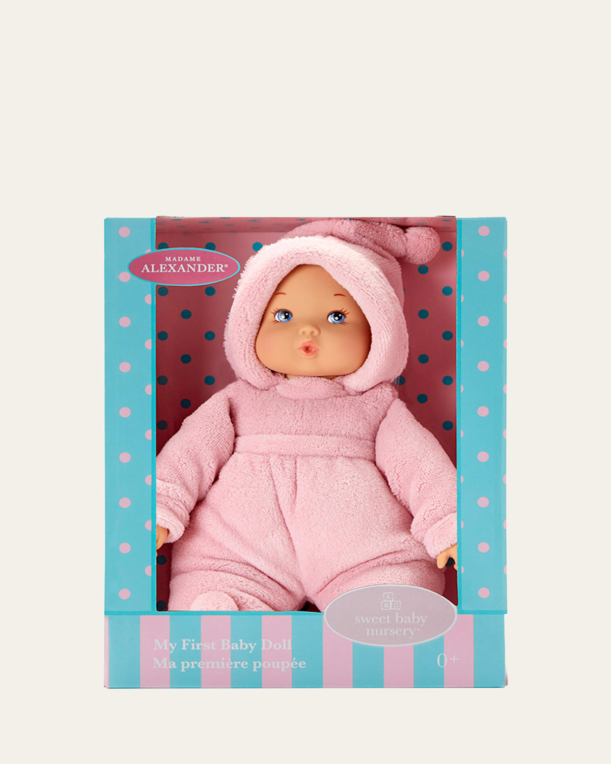 Dressed in pink plush, this baby is the perfect first doll for any little one. Cute and cuddly, this 12" newborn baby doll, with a soft fabric body is ready to be hugged. For ages newborn and up. Vinyl/polyester. 8"W x 5.5"D x 12"T. Imported.
