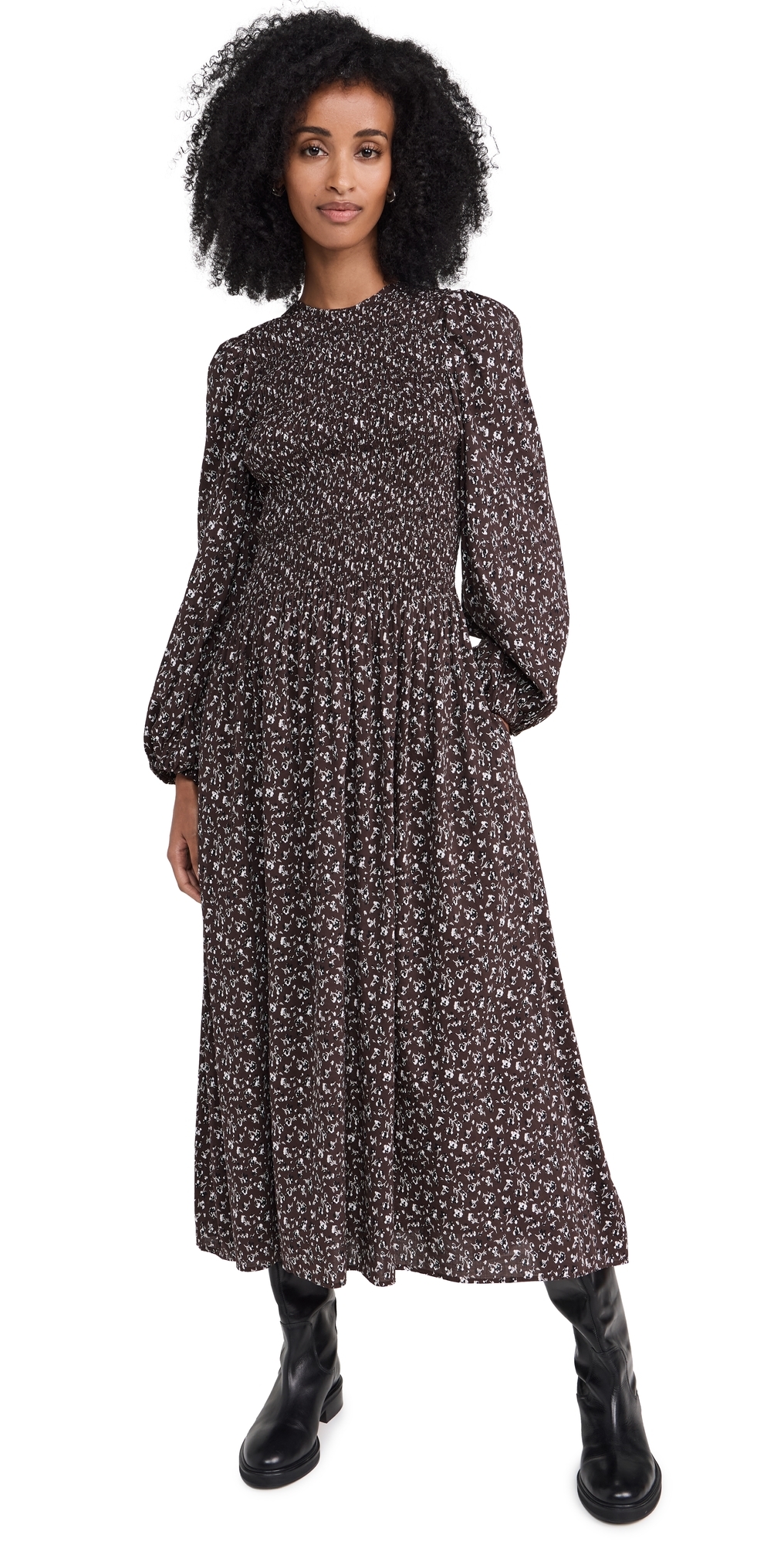 Fabric: Lightweight, non-stretch weave. Smocked elastic bodice. Floral print. Crew neck. Long puff sleeves with elastic cuffs. Button keyhole at back. On-seam side pockets. Shell: 55% cotton/45% viscose. Unlined. Wash cold. Imported, India. Measurements: Measurements from size XS Length: 51.25in / 130.0cm, from shoulder