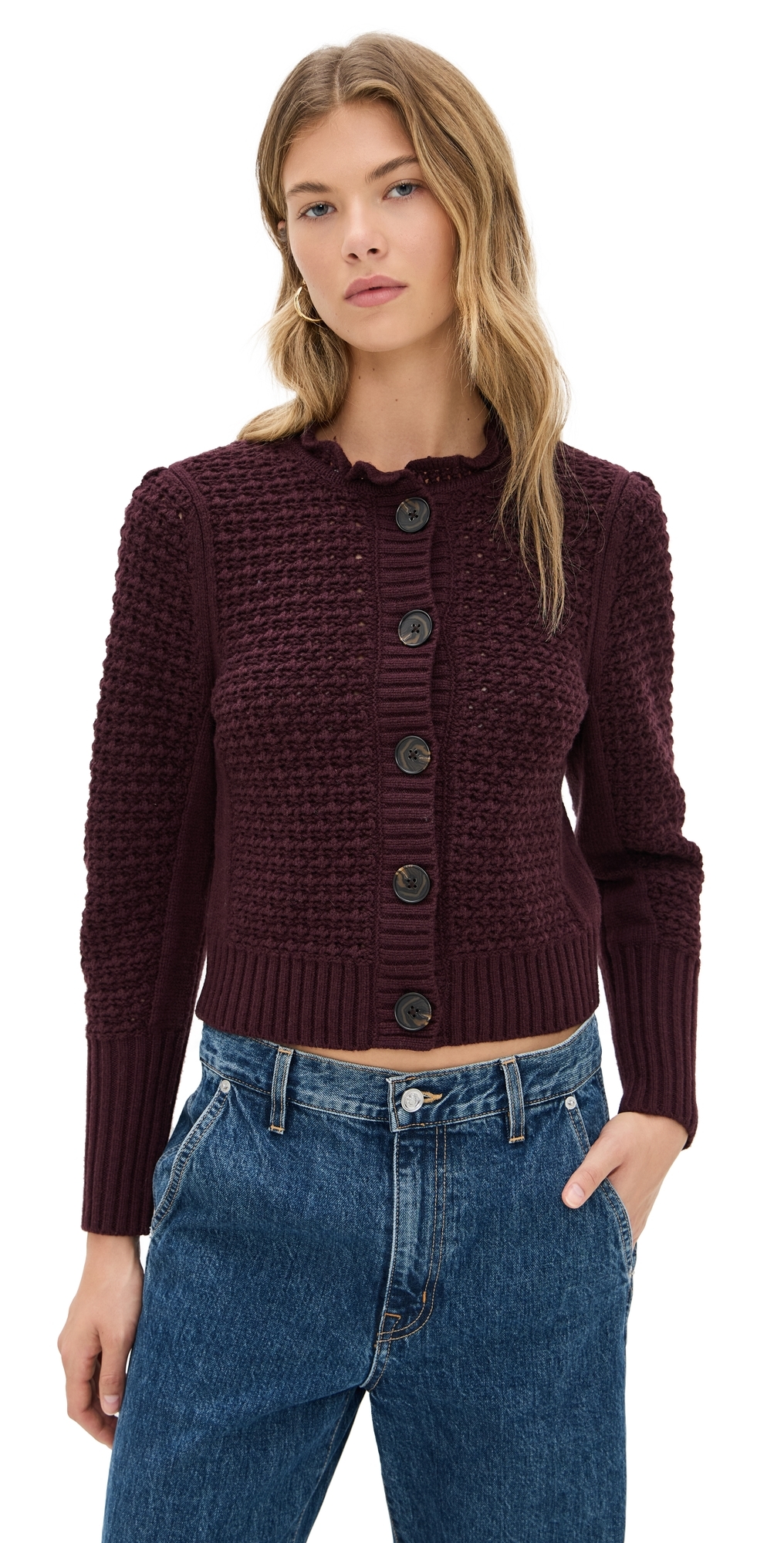 Fabric: Mid-weight stretch knit. Scalloped edges and ribbed trim. Crew neck. Long sleeves. Button placket. Shell: 80% wool/20% polyamide. Dry clean. Imported, Thailand. Measurements: Measurements from size S Length: 18.5in / 47.0cm, from shoulder
