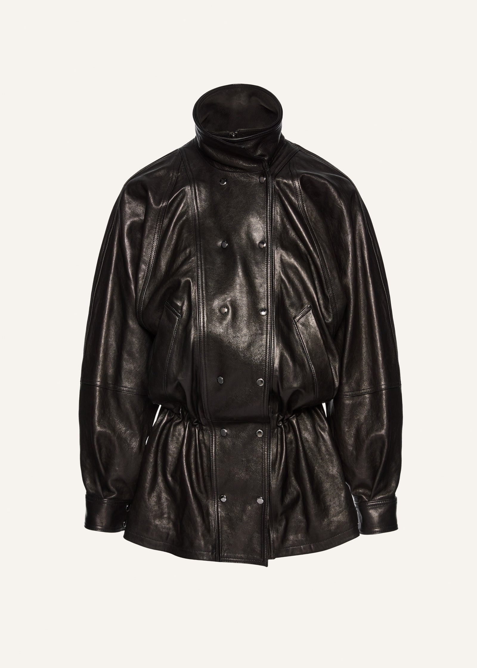 A longline jacket, cut from supple leather, with a cinched waist for a peplum effect. The jacket features a double snap button closure and a foldable high neck.