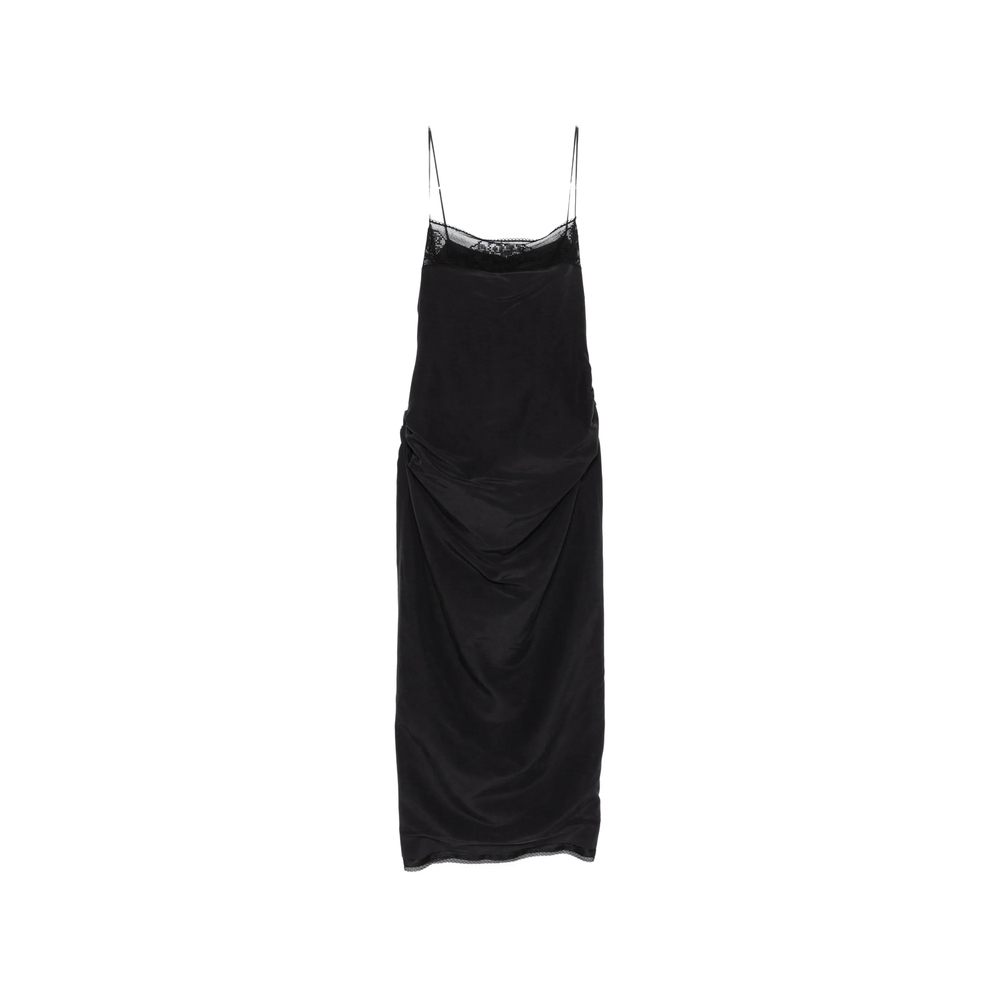 black lace trim spaghetti straps draped detail midi length sleeveless