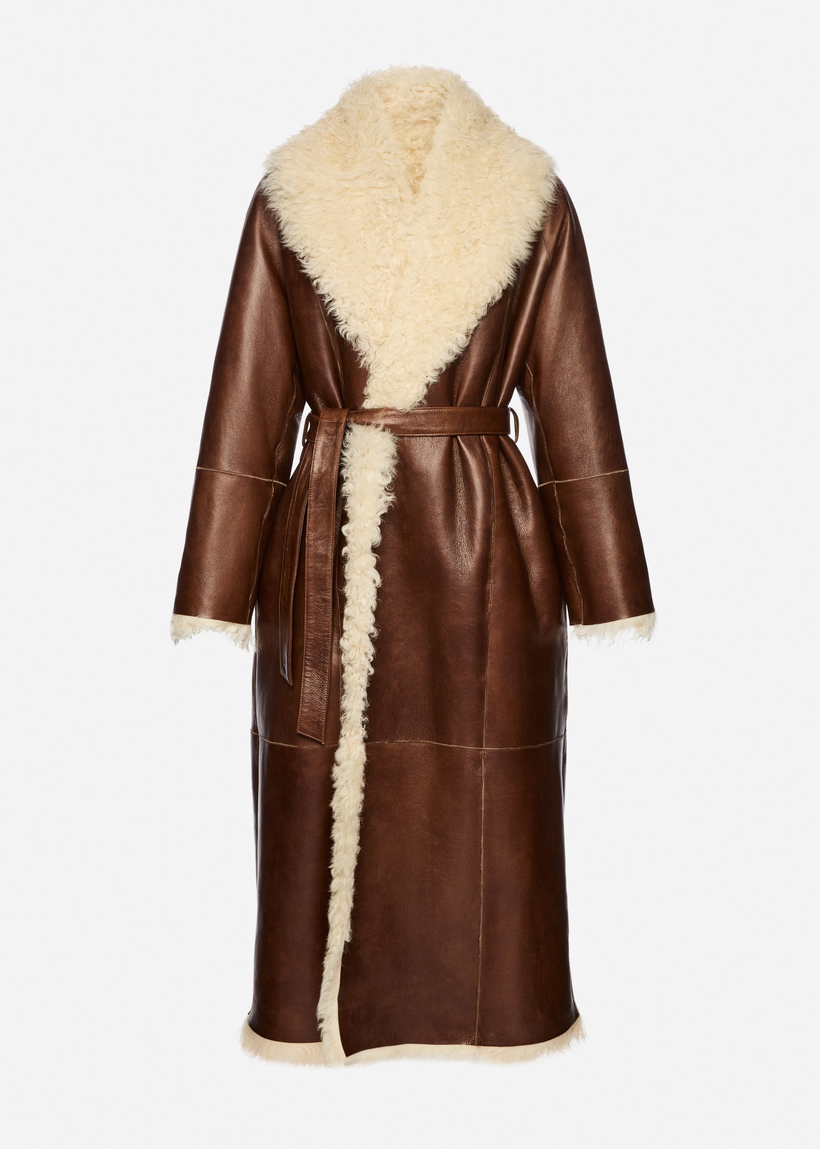 A full-length shearling coat crafted from rich brown leather with a soft cream interior. The sculptural silhouette features a dramatic shawl collar lined with plush curly shearling, extending through the lapel and hem for a bold contrast in texture. Designed with a matching leather belt to cinch the waist.