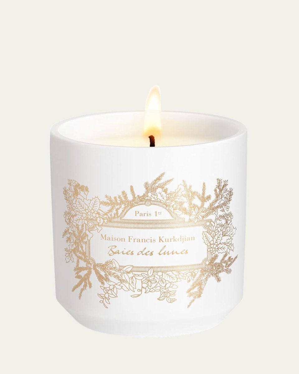 Maison Francis Kurkdjian Baies des Lunes Candle, 280 g What it is: The new Baies des Lunes candle celebrates mistletoe, the emblematic greenery symbolizing good luck in the festive winter cityscapes of Paris. It diffuses notes of enveloping musk and creamy woods. Fragrance profile: woody/musk The design on its Limoges porcelain jar pays tribute to the Maison's historic boutique at 5 Rue d'Alger, Paris. The limitededition Baies des Forêts candle will elevate your celebrations with a subtle scent. How to use: Trim wick to ¼" (0.6 cm) prior to each lighting. Place on a heatresistant, nonflammable surface. Keep away from drafts and walls. Burn at least 23 hours for first use, then no more than 3 hours at a time. Discontinue use when ½" (1.3 cm) of wax remains. 58 hours of burn time. 280 g Contains: geranyl acetate, citronellol, neryl acetate, geraniol, linalol, isocyclocitral, octahydro7methyl1,4methanonaphtalen6(2h)one, beta damascone, 1(2,6,6trimethyl1,3cyclohexadien1yl)2buten1one
