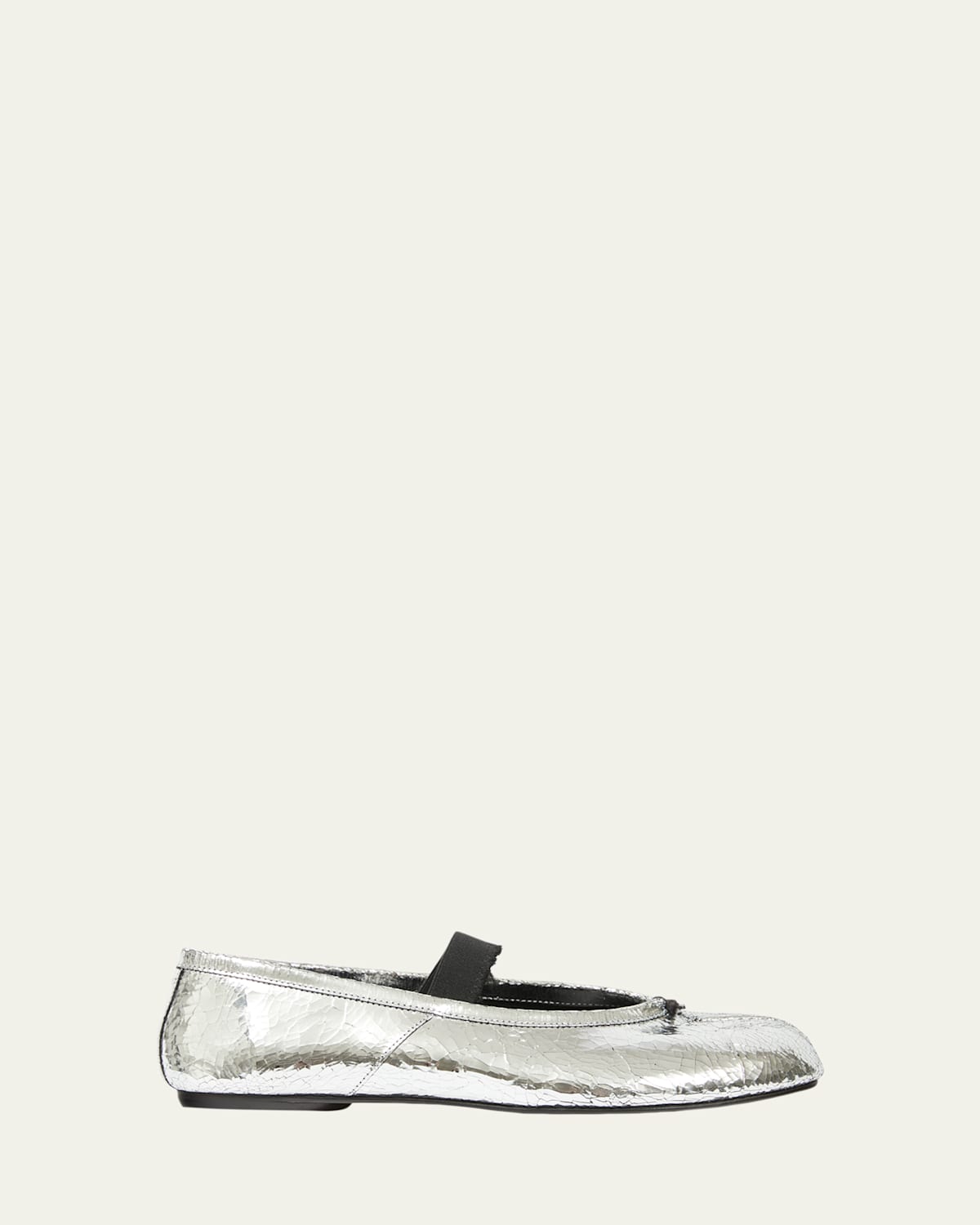 Maison Magiela "Tabi" ballerina flats crafted from calf leather with a broken mirror effect finish and signature split toe detail Flat heel Round toe Distressed elastic Mary Jane strap Slipon style Leather lining and outsole Spot clean, wipe clean Made in Italy