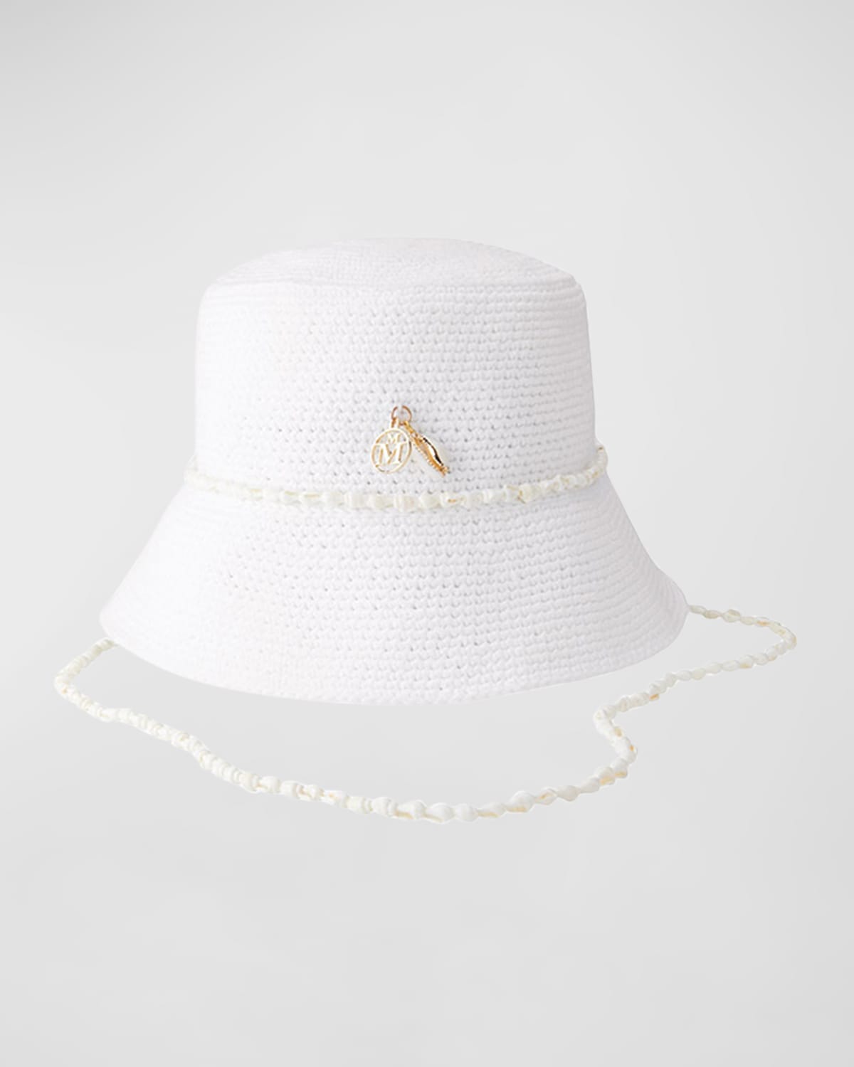 Maison Michel "Axel" crochet bucket hat with seashells strap Approx. 5.9"L x 10.4"H Rollable Flat crown Downturned brim Logo medallion on break Cotton/shell Wipe clean Made in Italy