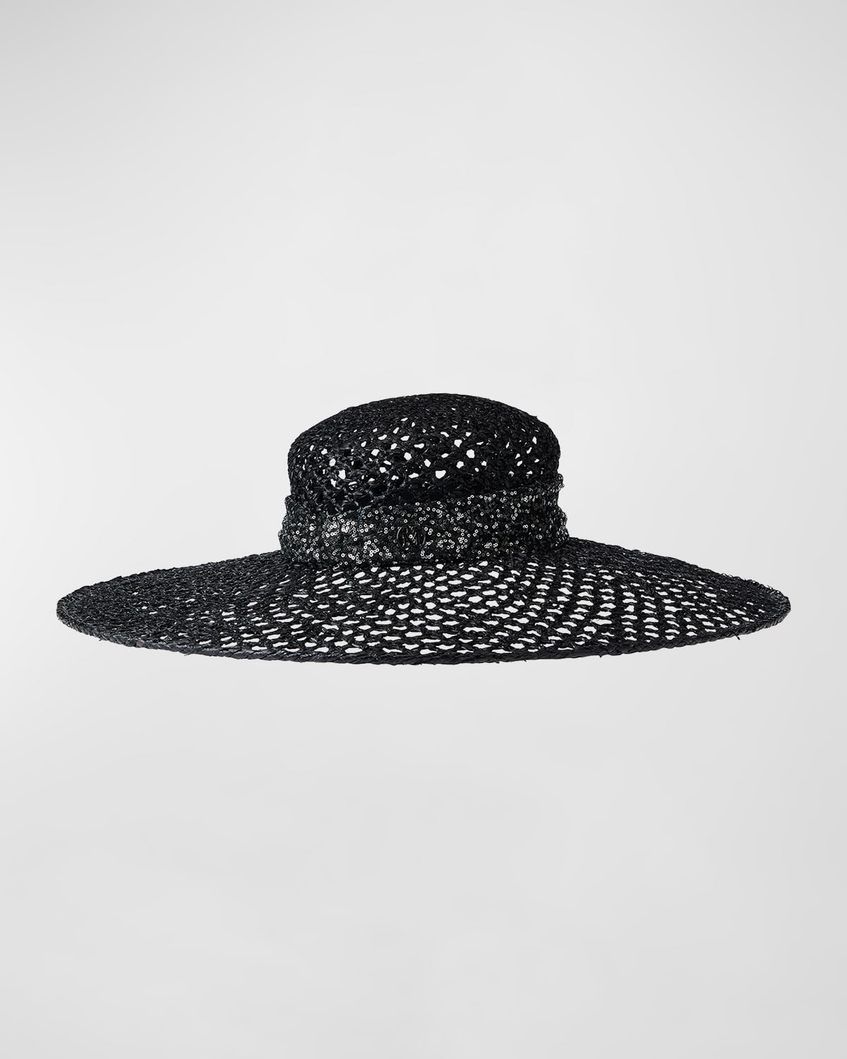 Maison Michel "Bianca" structured hat in raffia and polyester Round crown Sequin band on the break Flat, wide brim Made in Germany