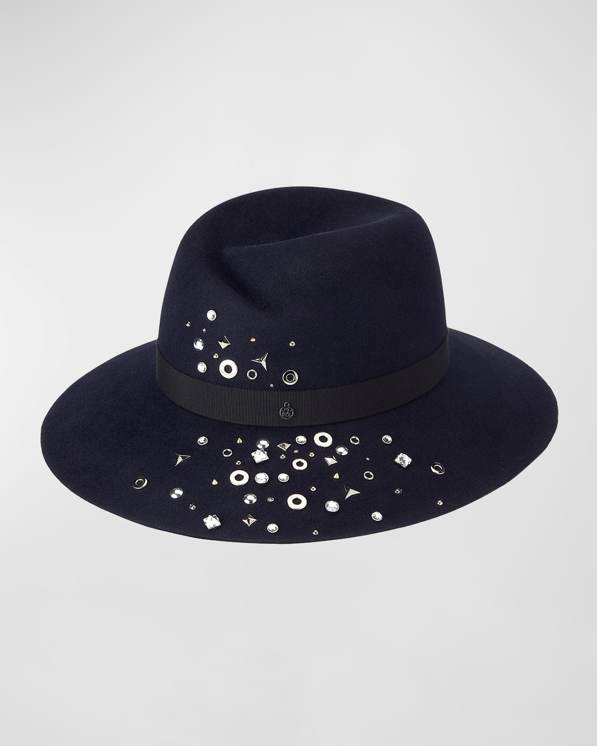 Maison Michel "Virginie" fedora in rabbit felt, viscose, and cotton Features strass, metal, and ABS plastic starlight studs Asymmetric crown Band on break; monogram charm Flat, wide brim Made in France