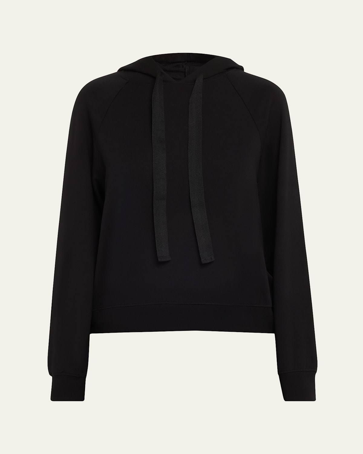 Majestic Filatures French terry sweatshirt crafted for comfort in a stylish grosgrain trim Approx. 21"L from shoulder to hem Hooded neckline; adjustable drawstrings Long raglan sleeves Slightly cropped hem Banded cuffs and hem Pullover style Viscose/elastane Machine wash warm Made in Portugal