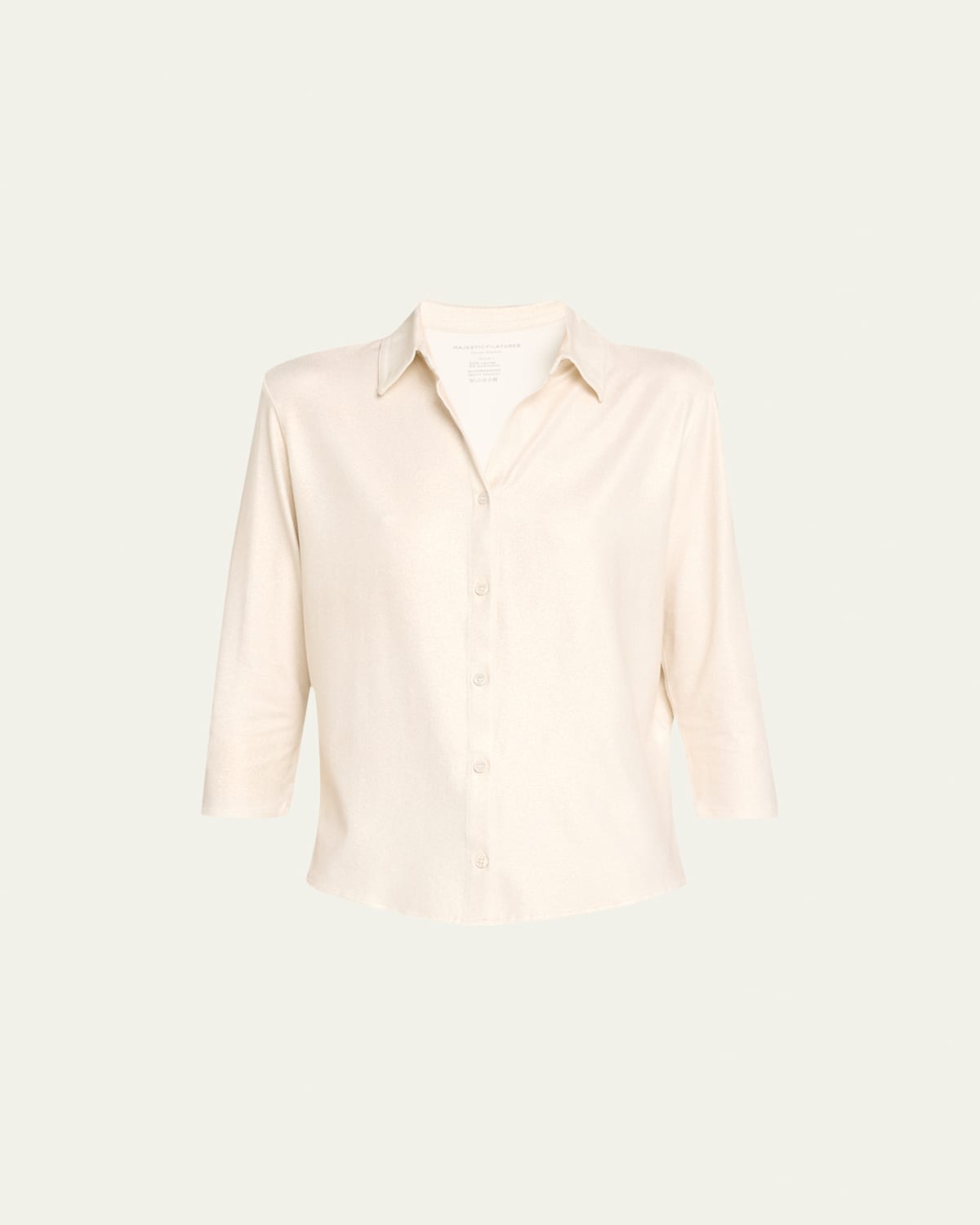 Majestic Filatures tee made from soft touch metallic fabric Approx. 23.5"L from shoulder to hem Spread collar; button front Dropped shoulders 3/4 sleeves; button cuffs Mini side slits Hip length Relaxed fit Viscose/elastane Machine wash warm Made in Portugal