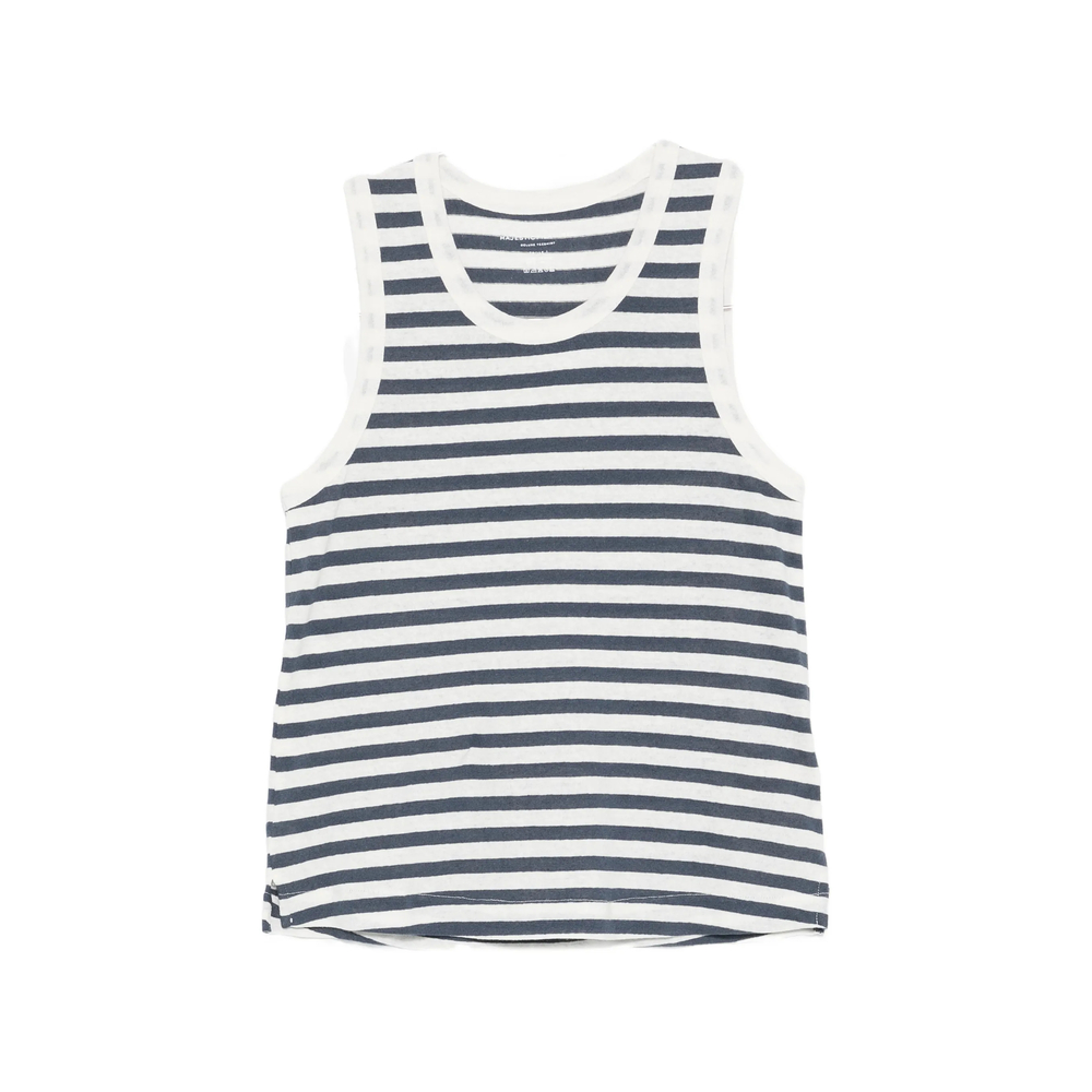 navy blue horizontal stripe pattern round neck sleeveless ribbed trim straight hem