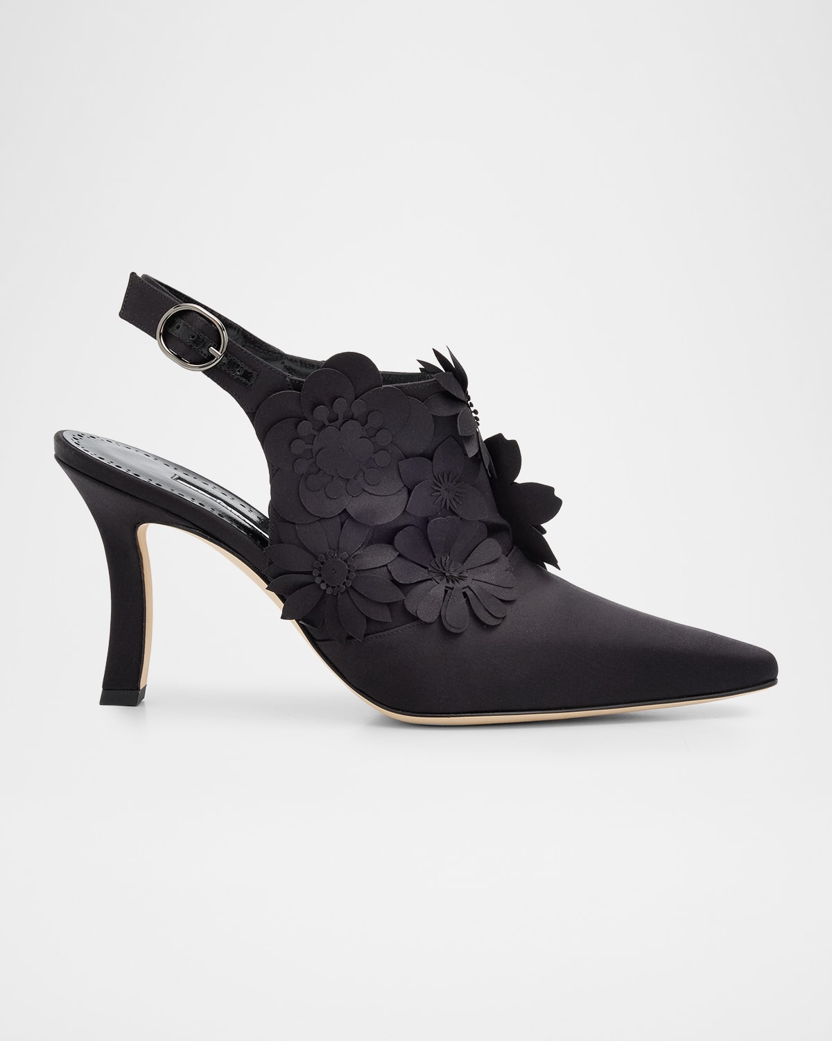Accentuated by 3D tonal florals, the "Antigonid" pumps by Manolo Blahnik are crafted from lustrous crepe silk 3.50 in / 90 mm covered stiletto heel Pointed toe Adjustable slingback strap Goat leather lining Leather outsole Made in Italy