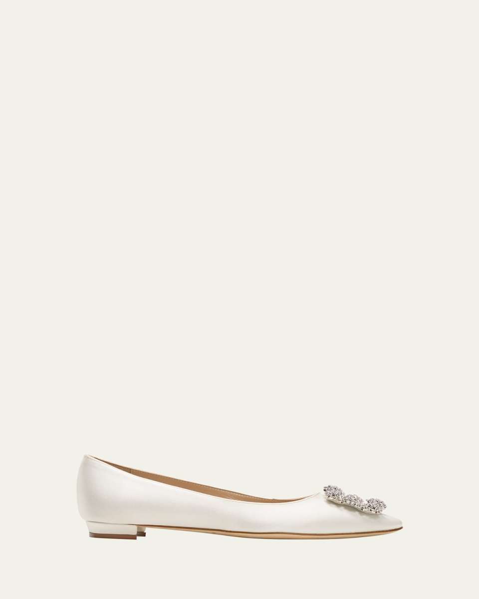 Manolo Blahnik satin ballerina flat with crystal buckle. 0.25 in / 10 mm flat heel. Pointed toe. Slipon style. Leather lining and sole. "Hangisi" is made in Italy.