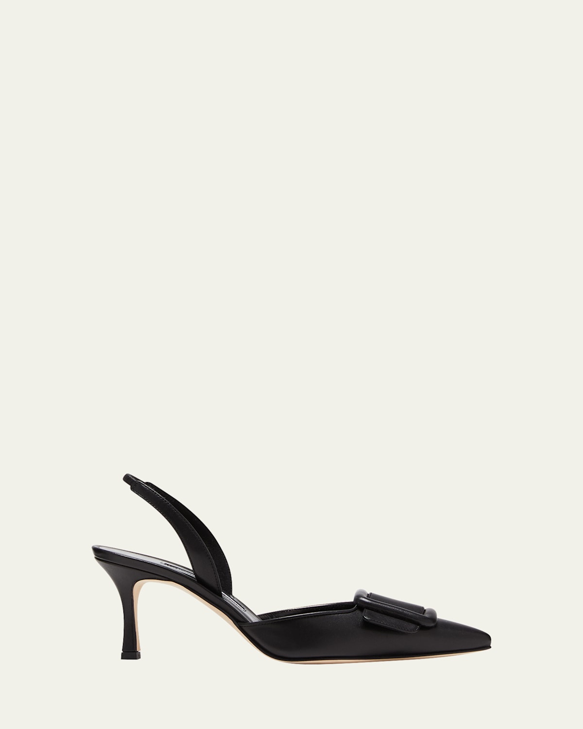 Manolo Blahnik "Maysli" leather pumps. 2.8" stiletto heel. Pointed toe. Buckle strap at vamp. Stretch slingback strap. Leather lining and sole. Made in Italy.