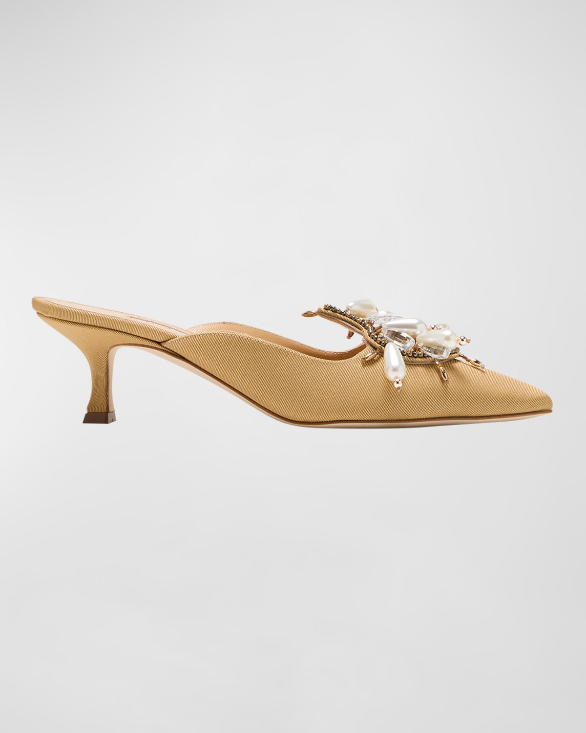 Manolo Blahnik "Orientalia" satin and Lurex® mules with pearly crystal dangle charm. 2.0" kitten heel. Pointed toe. Notched vamp. Slide style. Leather lining and sole. Made in Italy.