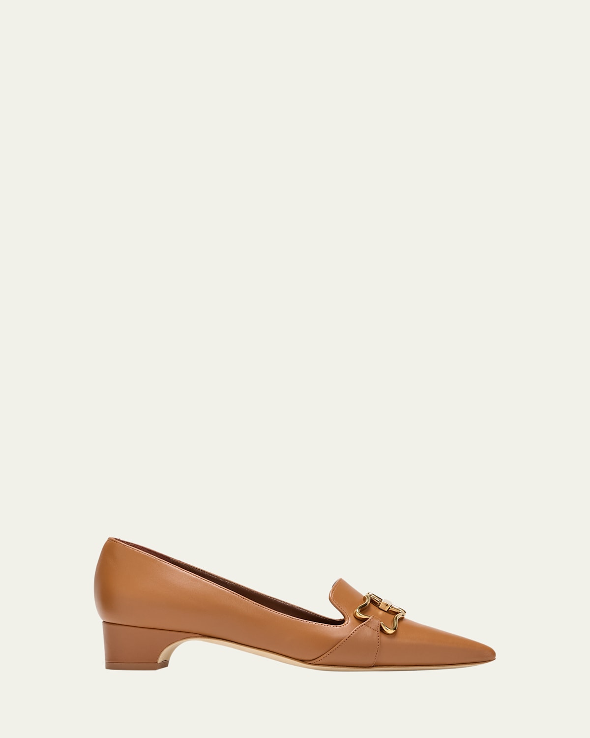 Manolo Blahnik "Phobepla" pumps in calf leather adorned with interlinked metal buckles for a timeless look 1.25 in / 30 mm block heel Pointed toe Notched vamp Leather outsole Lining: Goat leather Made in Italy
