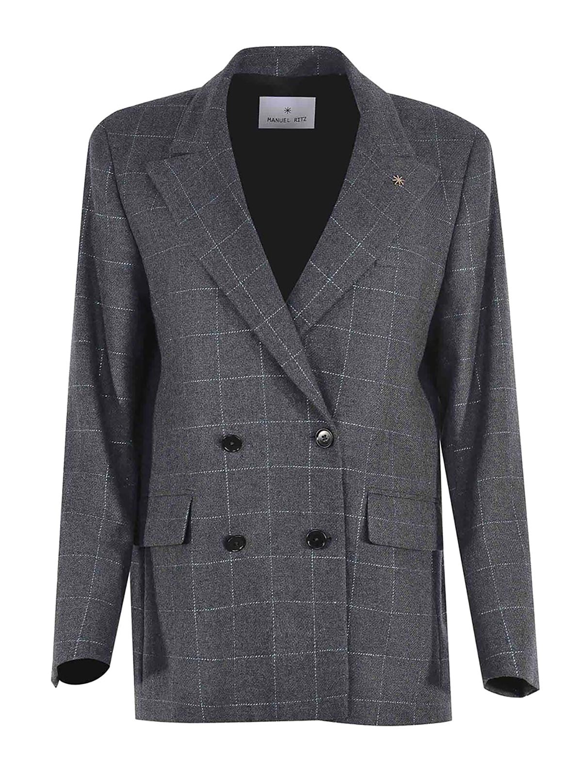 Veste Manuel Ritz en mélange gris anthracite à carreaux contrastants, larges revers en pointe, poche passepoilée plaquée sur la poitrine, manches longues doublées, poignets boutonnés, double boutonnage, bouton simple, deux poches latérales à rabat, fente centrale au dos