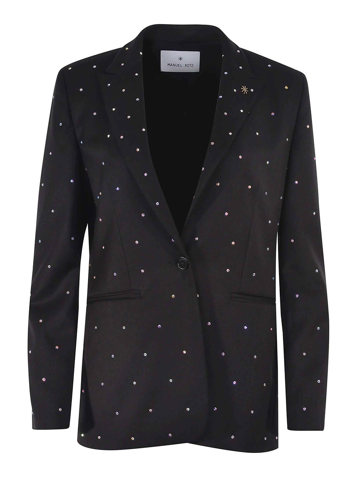 Veste Manuel Ritz en viscose mélangée noire à manches longues, une doublure entièrement boutonnée, application sur le dessus, larges revers à pointe pointue, deux poches passepoilées et une poche poitrine, fente centrale dans le dos