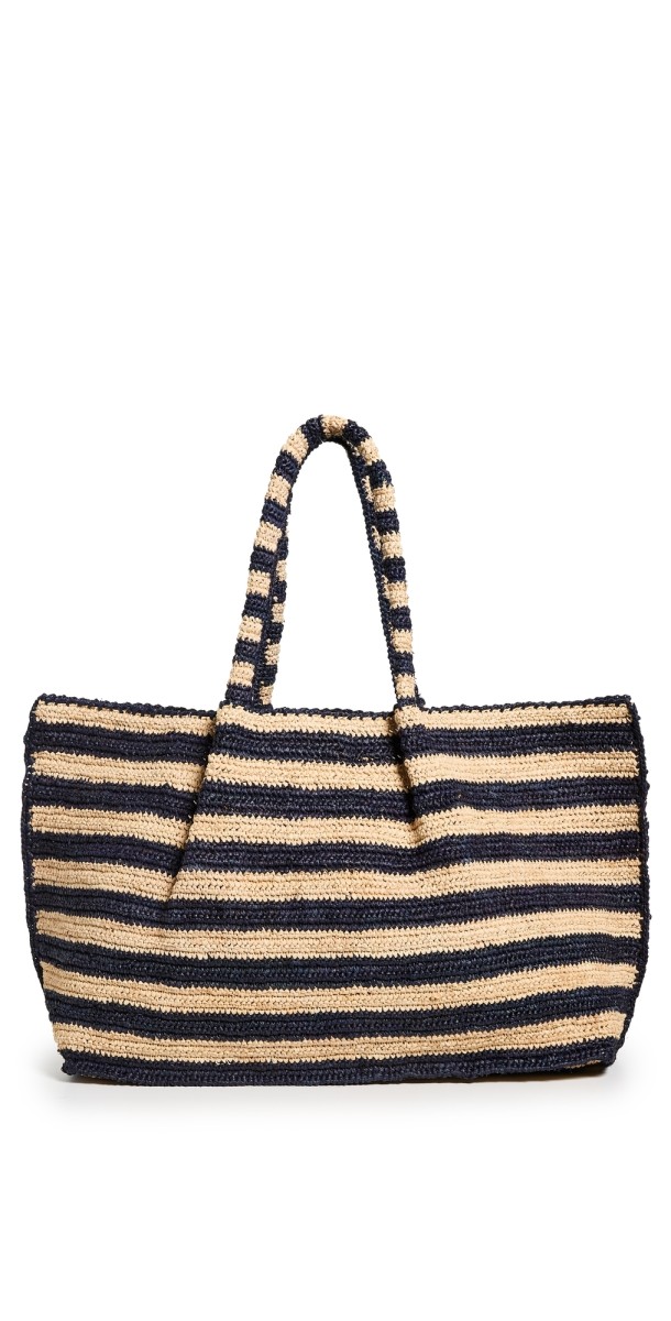 Woven straw. Stripe pattern. Magnetic snap. Patch interior pocket. Unlined. Weight: 25oz / 0.71kg. Imported, Madagascar. Measurements: Height: 12.25in / 31cm Length: 18.5in / 47cm Depth: 7.75in / 20cm Handle drop: 9in / 23cm