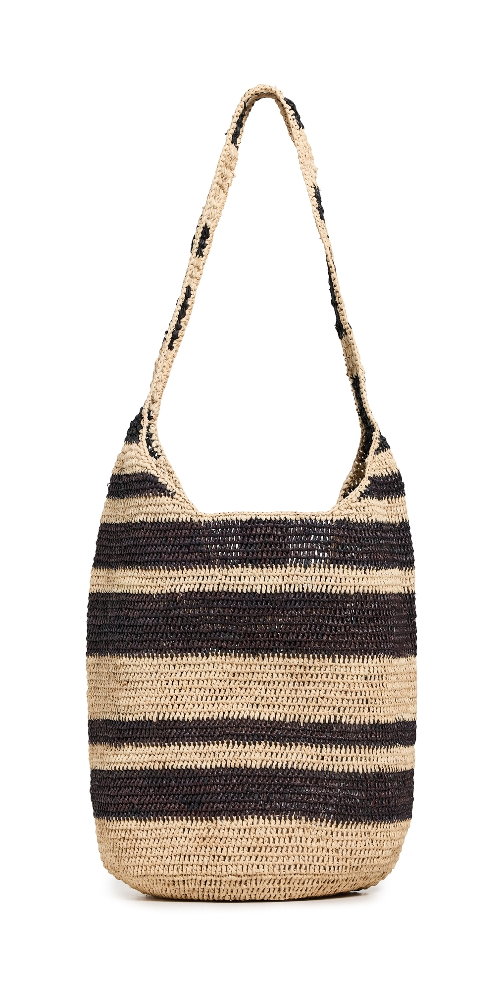 Raffia. Striped pattern. Magnetic closure. Patch interior pocket. Shoulder strap. Lining: Unlined. Weight: 9oz / 0.26kg. Imported, Madagascar. Measurements: Height: 11.75in / 30cm Length: 14.5in / 37cm Depth: 6.25in / 16cm Strap drop: 13in / 33cm