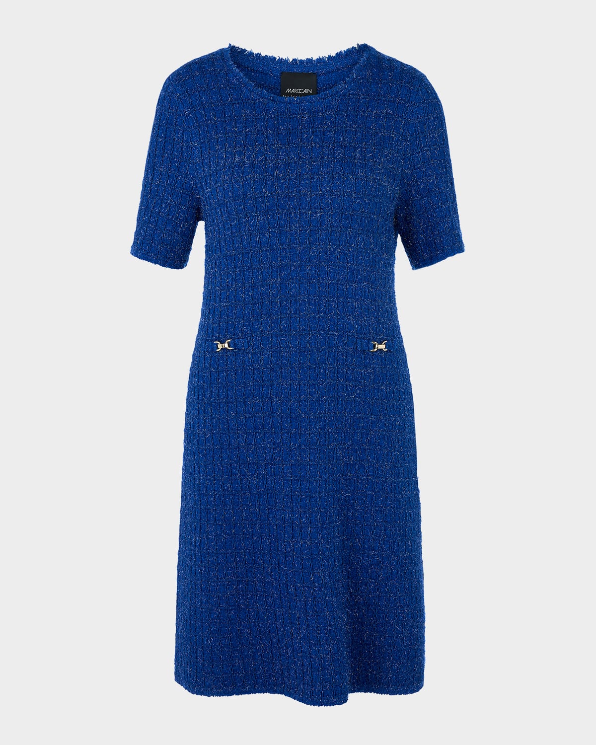 Marc Cain tweed knit mini dress with metallic clasp embellishments and fringe trim Scoop neckline Short sleeves Hem falls above the knee Aline silhouette Virgin wool/nylon/polyamide Lining: Polyester Hand wash Made in Hungary