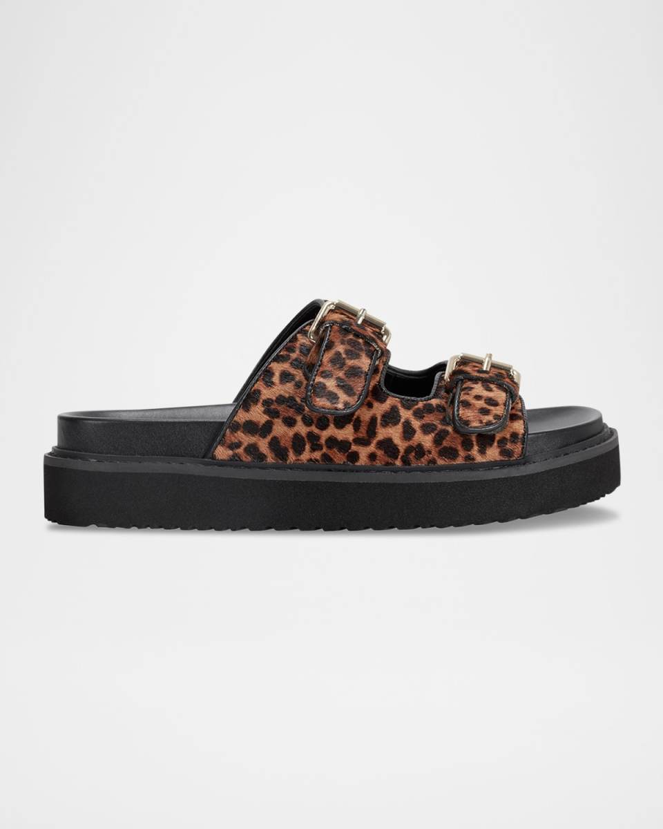 Agustaly Leopard Calf Hair Dual-Buckle Slide Sandals