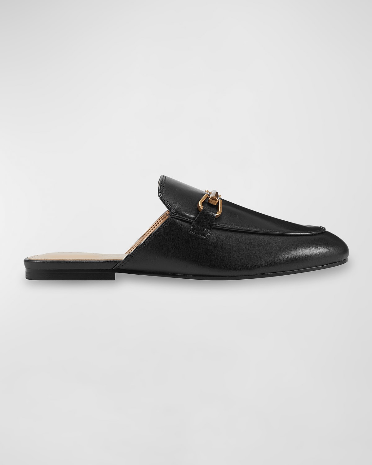 Marc Fisher LTD leather loafer mules with metal bit strap Flat heel Round apron toe Notched vamp Slide style Manmade outsole Lining: Synthetic Spot clean Imported